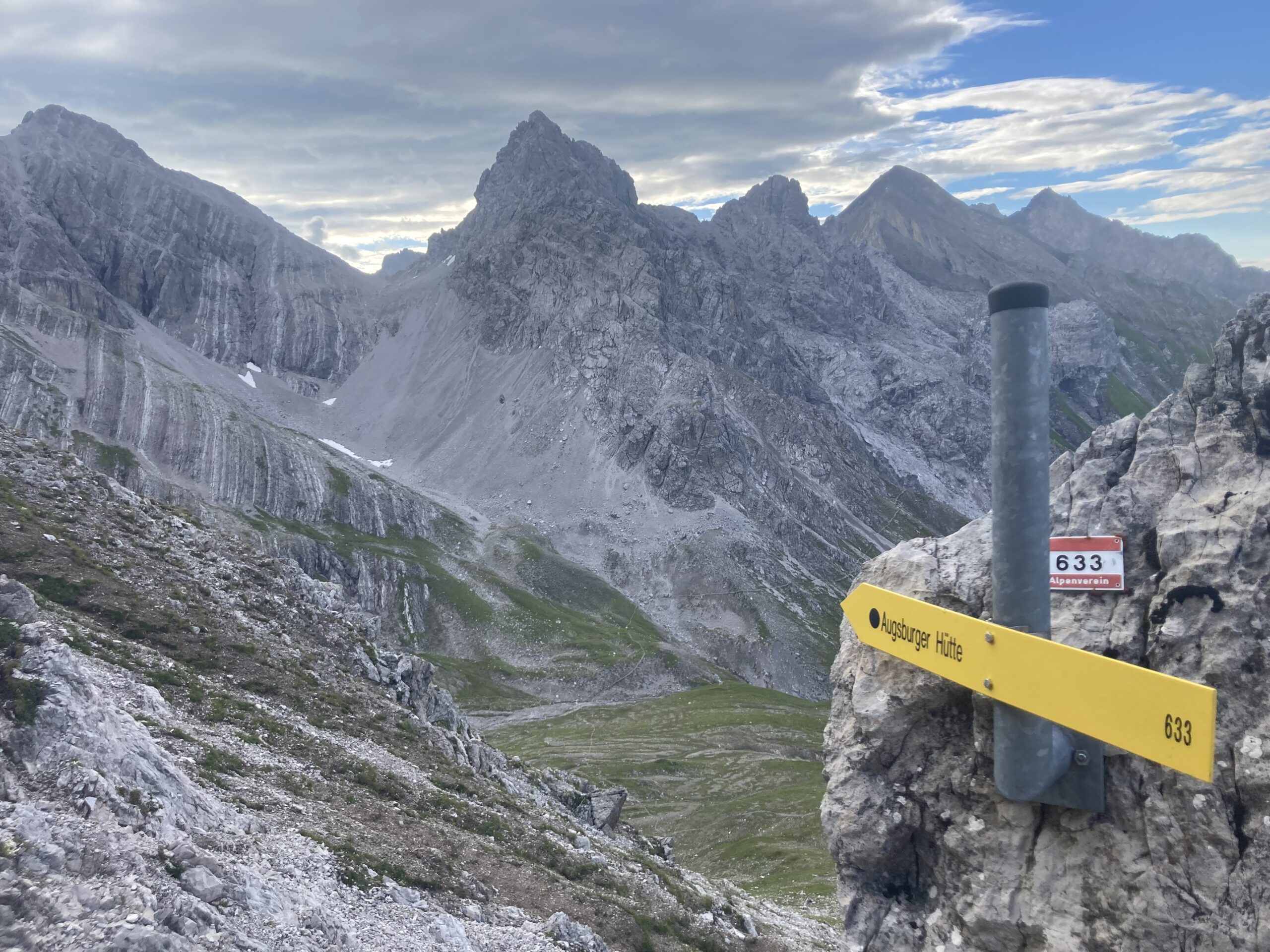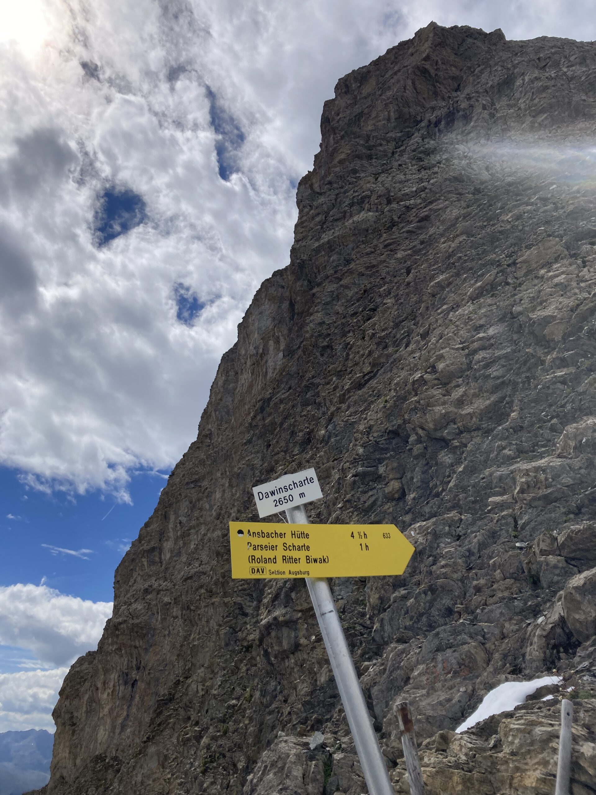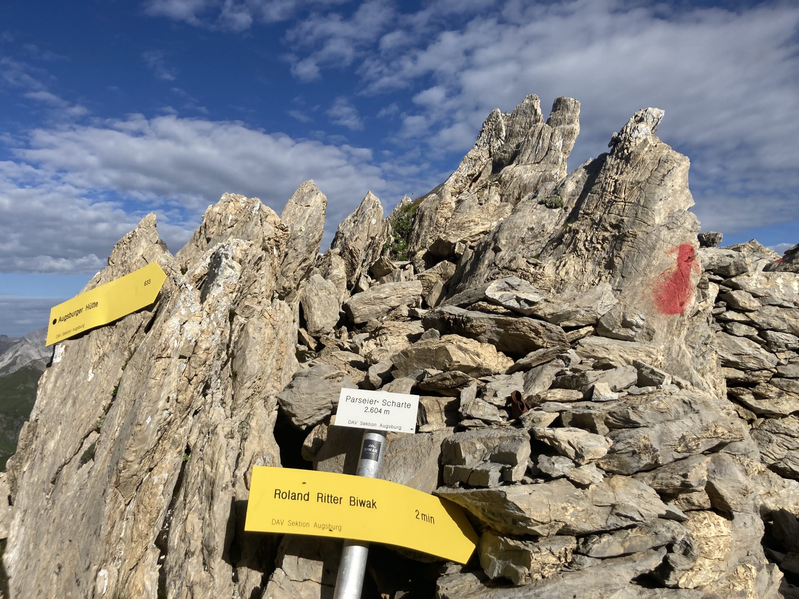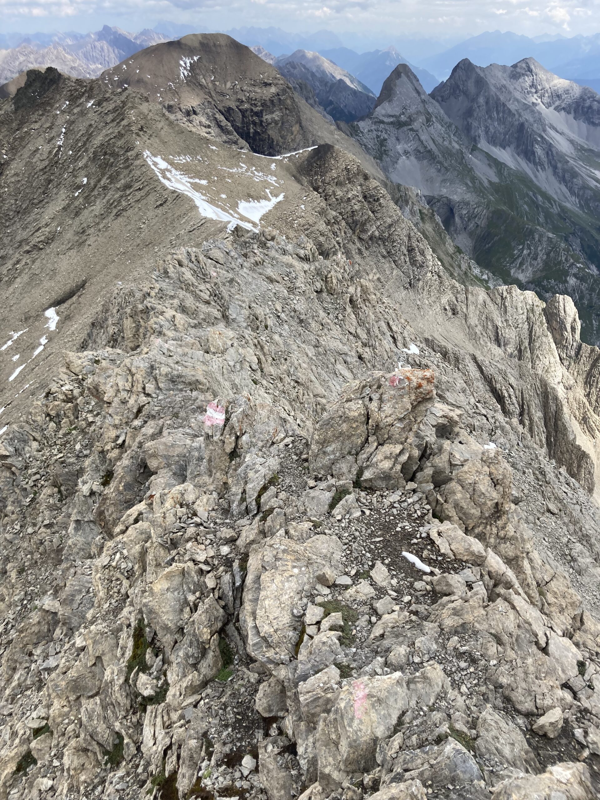 Wecker 6:00 Uhr, Frühstück 6:30 Uhr, Aufbruch 6:54 Uhr, schnell unterwegs bis hoch zum Winterjoch, dort Einstieg in den höhenweg und durch den ersten Teil des Weges, teilweise leichte Kletterei, Schneefeld gequert, durch Schuttfeld hoch bis zur Biwackschachtel am Parseier-Scharte, 2:15h Gehzeit, kurze Pause gemacht, Diskussion ob wir die Eisenspitze mit machen wollen weil so schnell unterwegs, Rucksäcke deponiert und ohne Rucksack Richtung Eisenspitze, steiler Anstieg über Bergrücken, Schuttfeld gequert auf den Eisenkopf, dort am Grat entlang in eine Scharte abgestiegen und von dort wieder ein Schuttfeld hoch (Gämse) zur nächsten Scharte und den mit Fixseilen gesicherten Weg auf den Gipfel der Eisenspitze 2860m, schöne 2er Kletterei, Rückweg nicht über den Grat des Eisenkopfes sondern unterhalb gequert, sehr brüchig alles dort, gefährlich, zurück bei den Rucksäcken weiter auf den Höhenweg, etwas abgestiegen und kurz vor dem gelben Scharterl (Schlüsselstelle) Seil über Schneefeld repariert, interessanter Weg am Hang, immer mal weggerutscht, schmal, Geröll, Schneefeld seilversichert, kein Problem, Scharterl hoch gekletter auch unkritisch, dann Aufstieg zum Dawinkopf, ein bisschen am Grat entlang, oben schöne Kletterei, Gipfel Dawinkopf 2970m, Pause gemacht, dann weiter Richtung Parseierspitze Abstieg vom Dawinkopf sehr interessant mit Stahlseilen versichert, teilweise ausgesetzt, am Grinner Ferner abgestiegen bzw. durch Schnee runter und durch die Gasillschlucht, ebenfalls Drahtseile und Leitern und Geröllfeld zur Augsburger Hütte, Kaiserschmarrn und alkoholfreies Weizen, Nachmittag auf der Terrassen verbracht, Abendessen sehr spät aber sehr gut, Pastinakensuppe, Kichererbsencurry und Mouse Chocolate, dann schweres Gewitter und starker Regen, wieder Diskussion wegen Aufbruch zur Parseierspitze am nächsten Tag, Thermofrühstück für 6 Uhr bestellt, im Lager im Nebenhaus unter dem Dach geschlafen