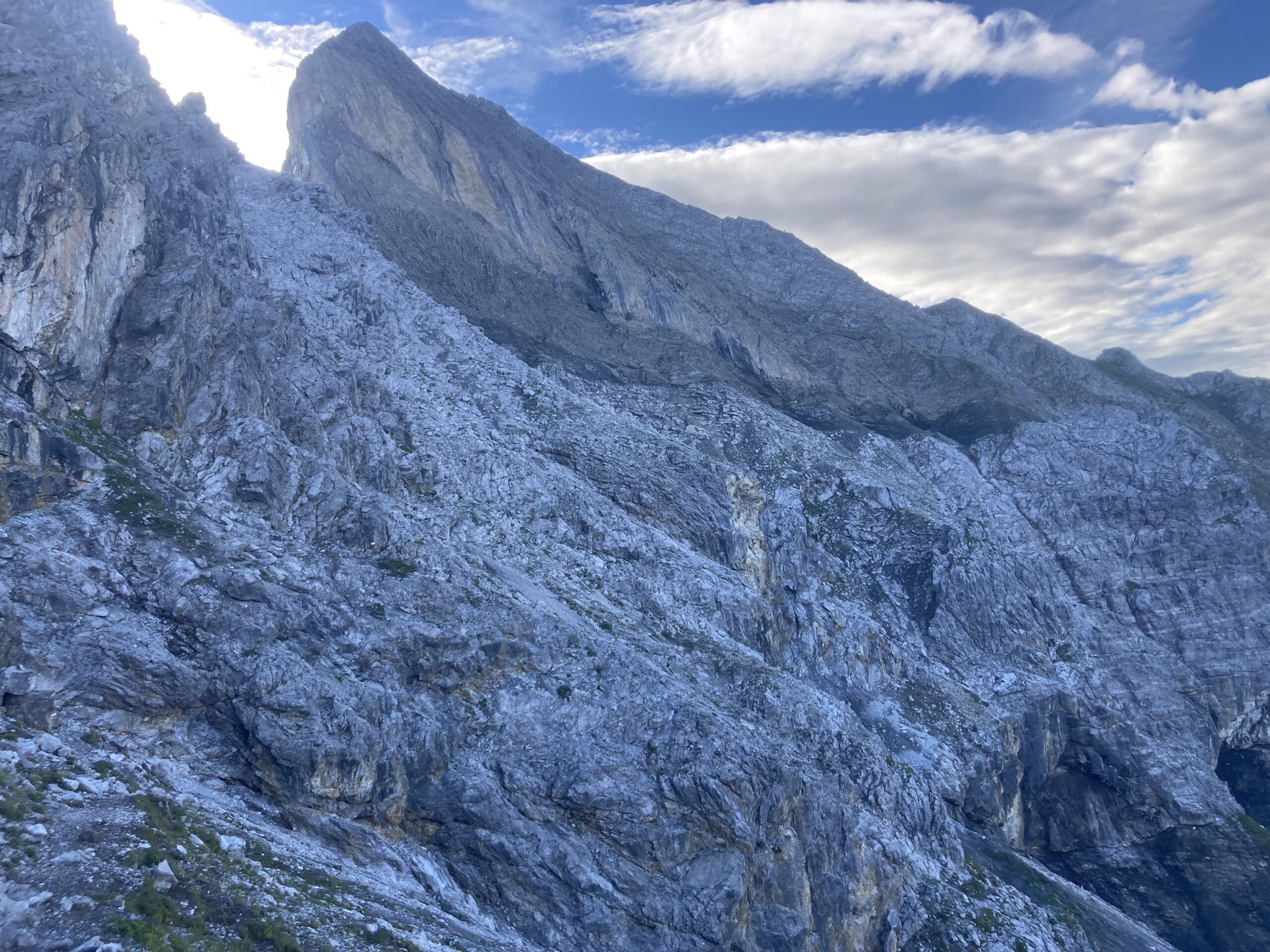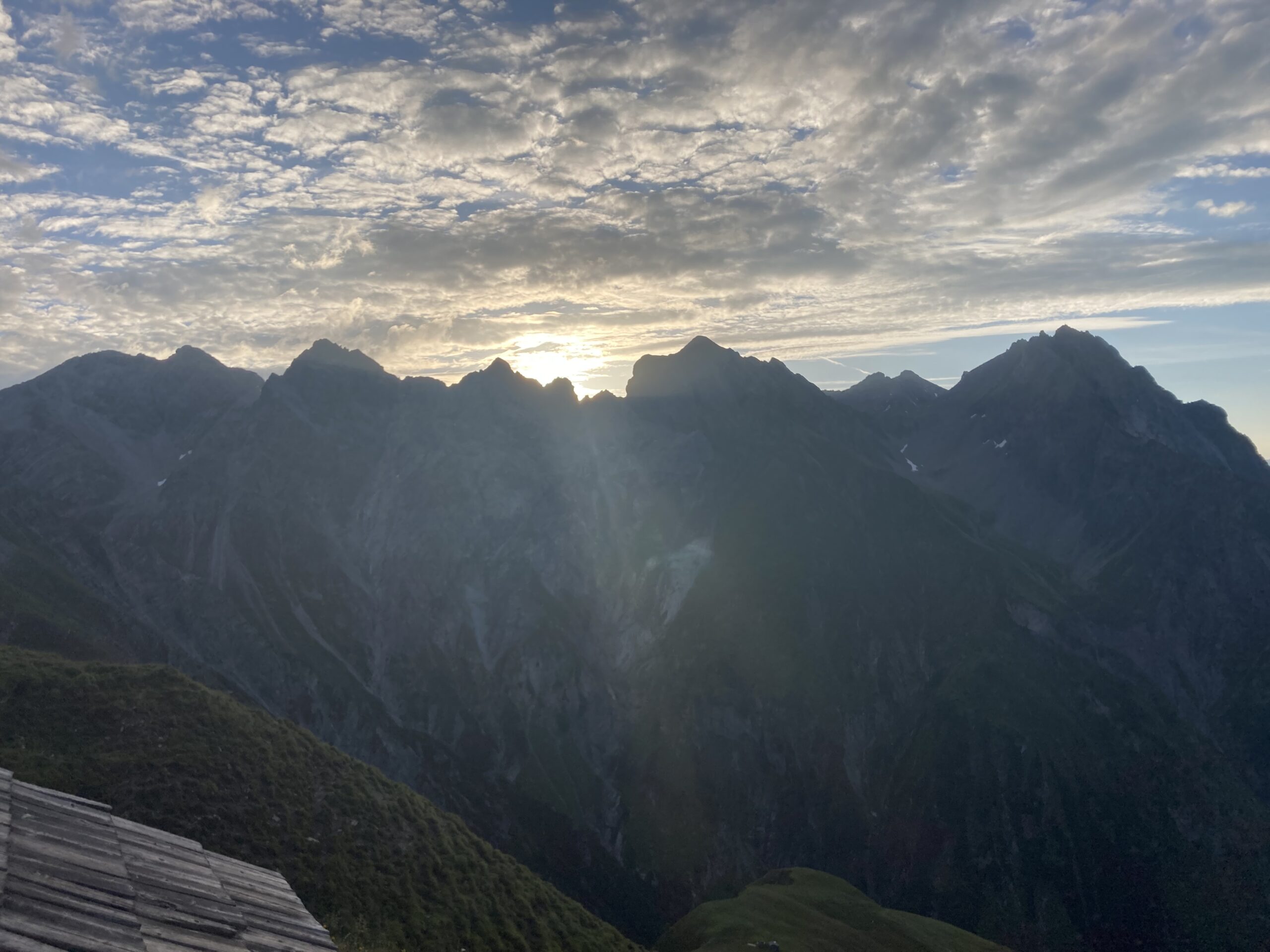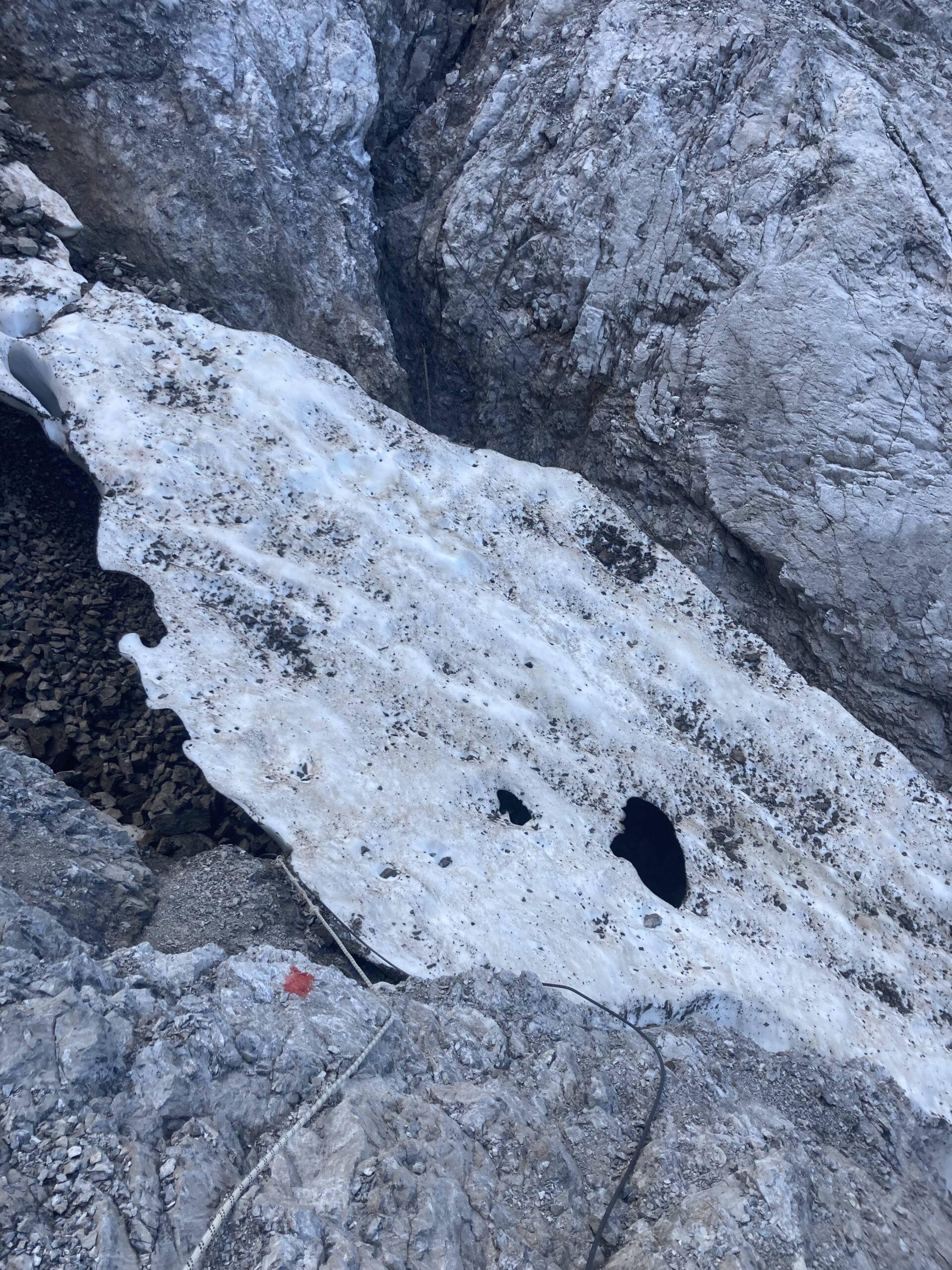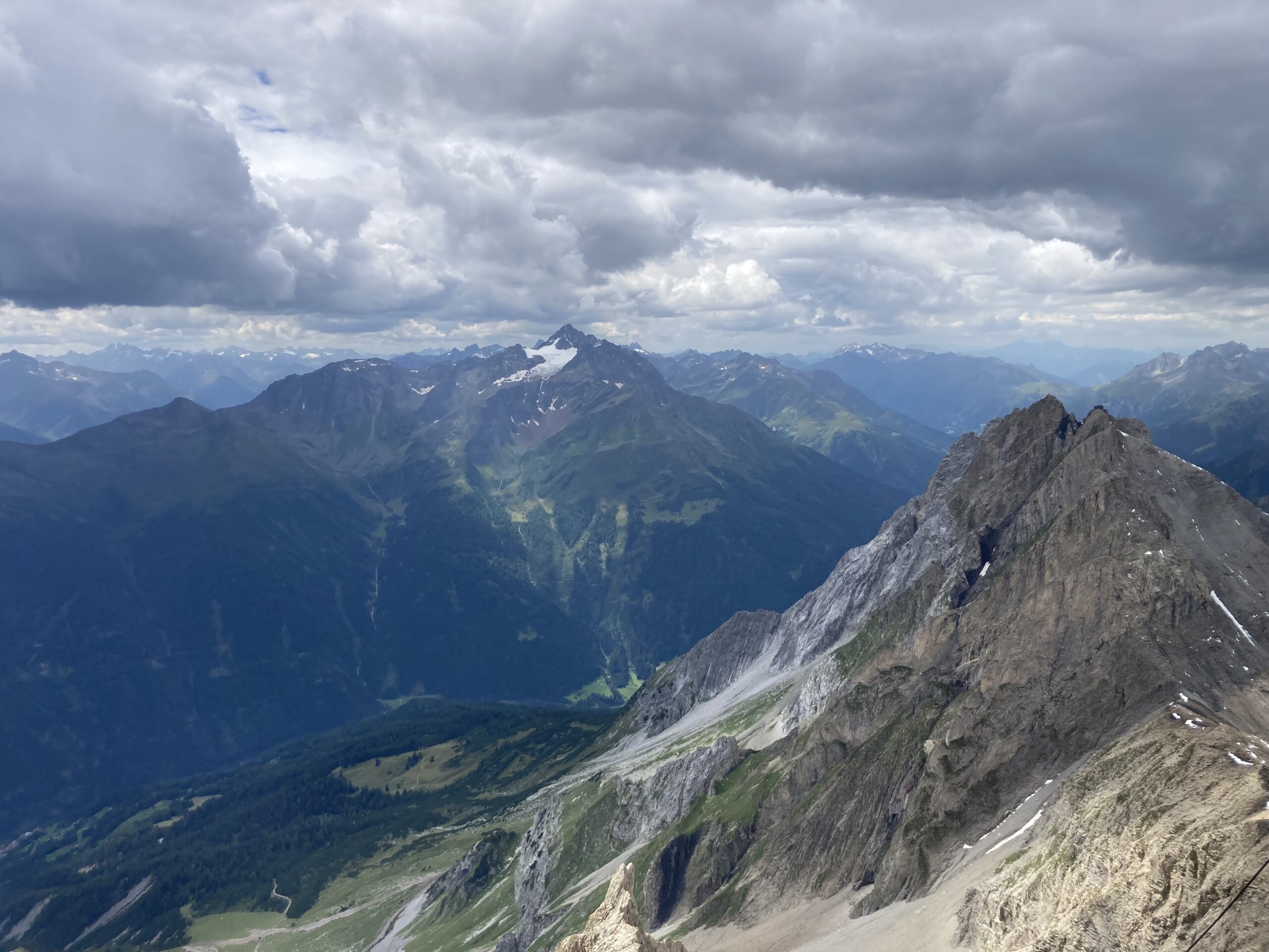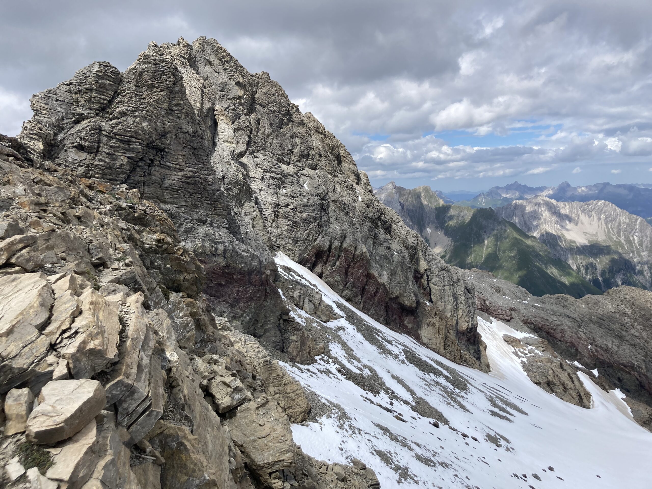 Wecker 6:00 Uhr, Frühstück 6:30 Uhr, Aufbruch 6:54 Uhr, schnell unterwegs bis hoch zum Winterjoch, dort Einstieg in den höhenweg und durch den ersten Teil des Weges, teilweise leichte Kletterei, Schneefeld gequert, durch Schuttfeld hoch bis zur Biwackschachtel am Parseier-Scharte, 2:15h Gehzeit, kurze Pause gemacht, Diskussion ob wir die Eisenspitze mit machen wollen weil so schnell unterwegs, Rucksäcke deponiert und ohne Rucksack Richtung Eisenspitze, steiler Anstieg über Bergrücken, Schuttfeld gequert auf den Eisenkopf, dort am Grat entlang in eine Scharte abgestiegen und von dort wieder ein Schuttfeld hoch (Gämse) zur nächsten Scharte und den mit Fixseilen gesicherten Weg auf den Gipfel der Eisenspitze 2860m, schöne 2er Kletterei, Rückweg nicht über den Grat des Eisenkopfes sondern unterhalb gequert, sehr brüchig alles dort, gefährlich, zurück bei den Rucksäcken weiter auf den Höhenweg, etwas abgestiegen und kurz vor dem gelben Scharterl (Schlüsselstelle) Seil über Schneefeld repariert, interessanter Weg am Hang, immer mal weggerutscht, schmal, Geröll, Schneefeld seilversichert, kein Problem, Scharterl hoch gekletter auch unkritisch, dann Aufstieg zum Dawinkopf, ein bisschen am Grat entlang, oben schöne Kletterei, Gipfel Dawinkopf 2970m, Pause gemacht, dann weiter Richtung Parseierspitze Abstieg vom Dawinkopf sehr interessant mit Stahlseilen versichert, teilweise ausgesetzt, am Grinner Ferner abgestiegen bzw. durch Schnee runter und durch die Gasillschlucht, ebenfalls Drahtseile und Leitern und Geröllfeld zur Augsburger Hütte, Kaiserschmarrn und alkoholfreies Weizen, Nachmittag auf der Terrassen verbracht, Abendessen sehr spät aber sehr gut, Pastinakensuppe, Kichererbsencurry und Mouse Chocolate, dann schweres Gewitter und starker Regen, wieder Diskussion wegen Aufbruch zur Parseierspitze am nächsten Tag, Thermofrühstück für 6 Uhr bestellt, im Lager im Nebenhaus unter dem Dach geschlafen