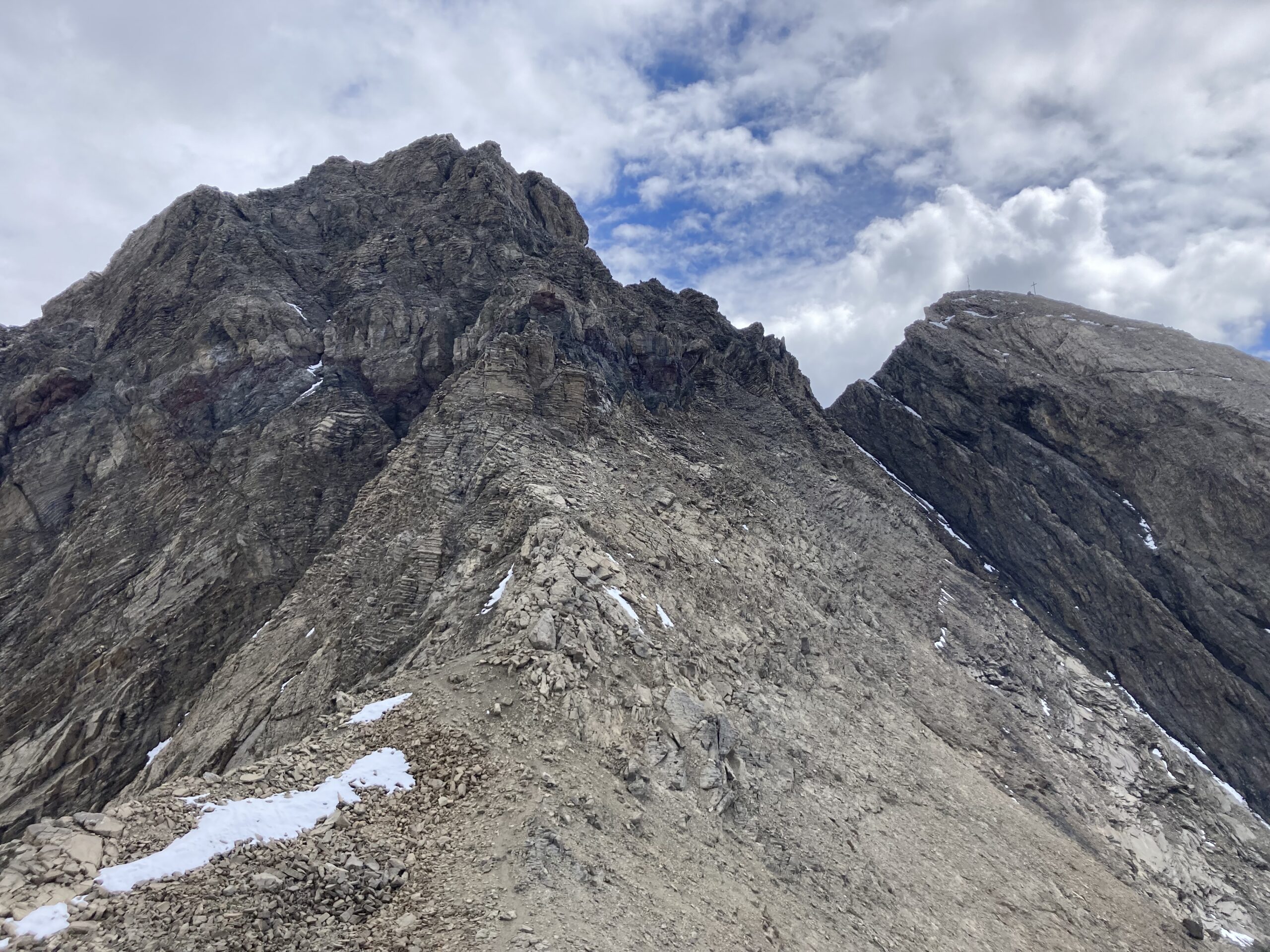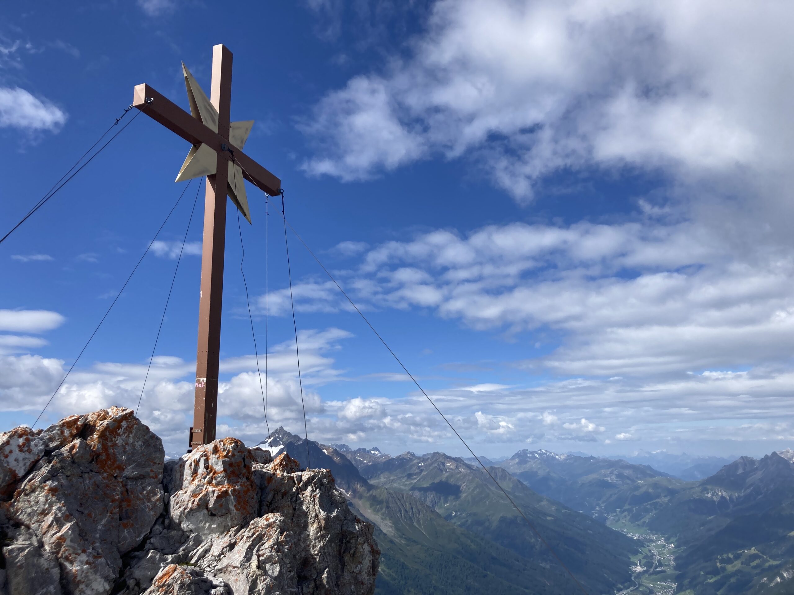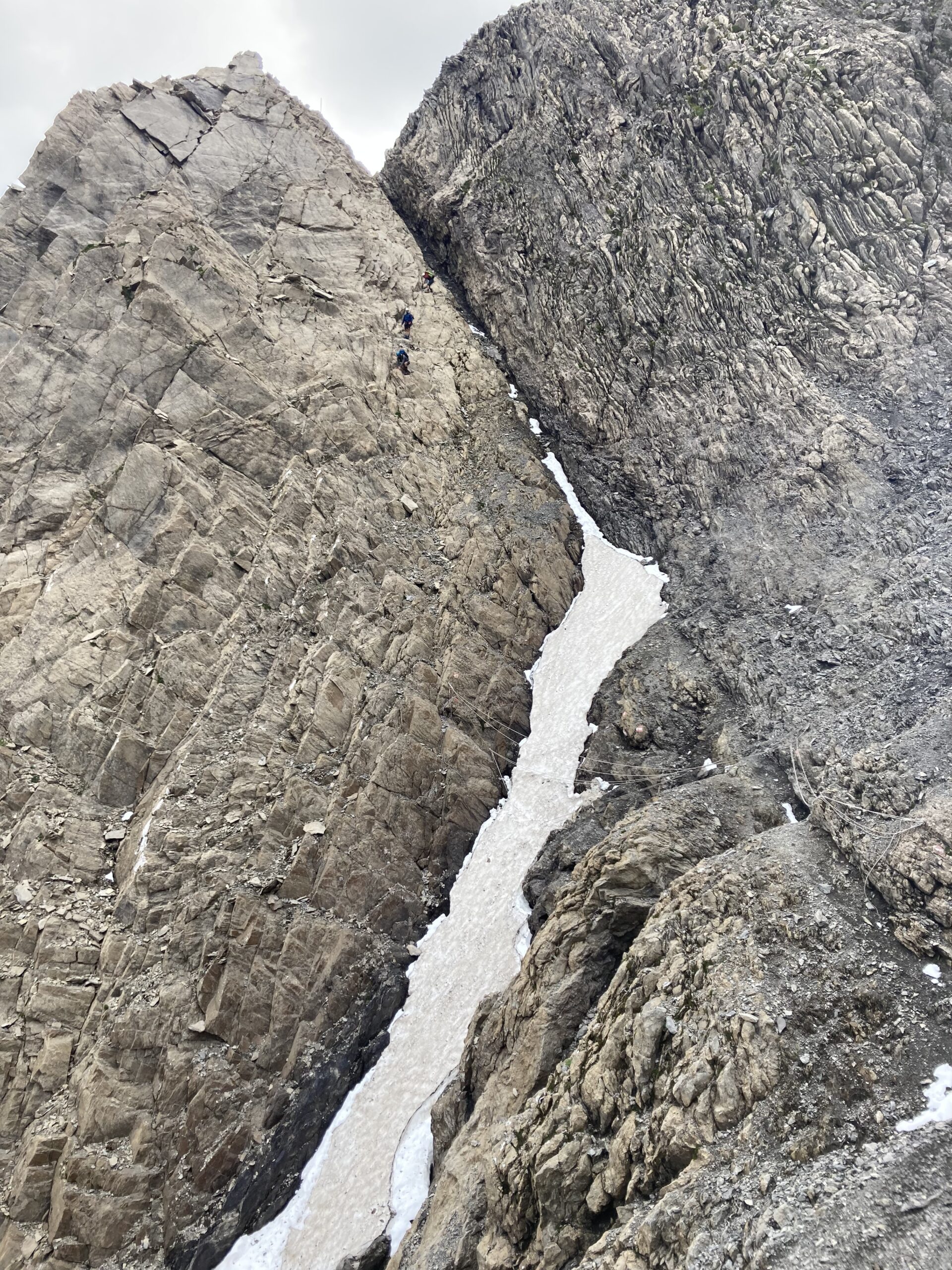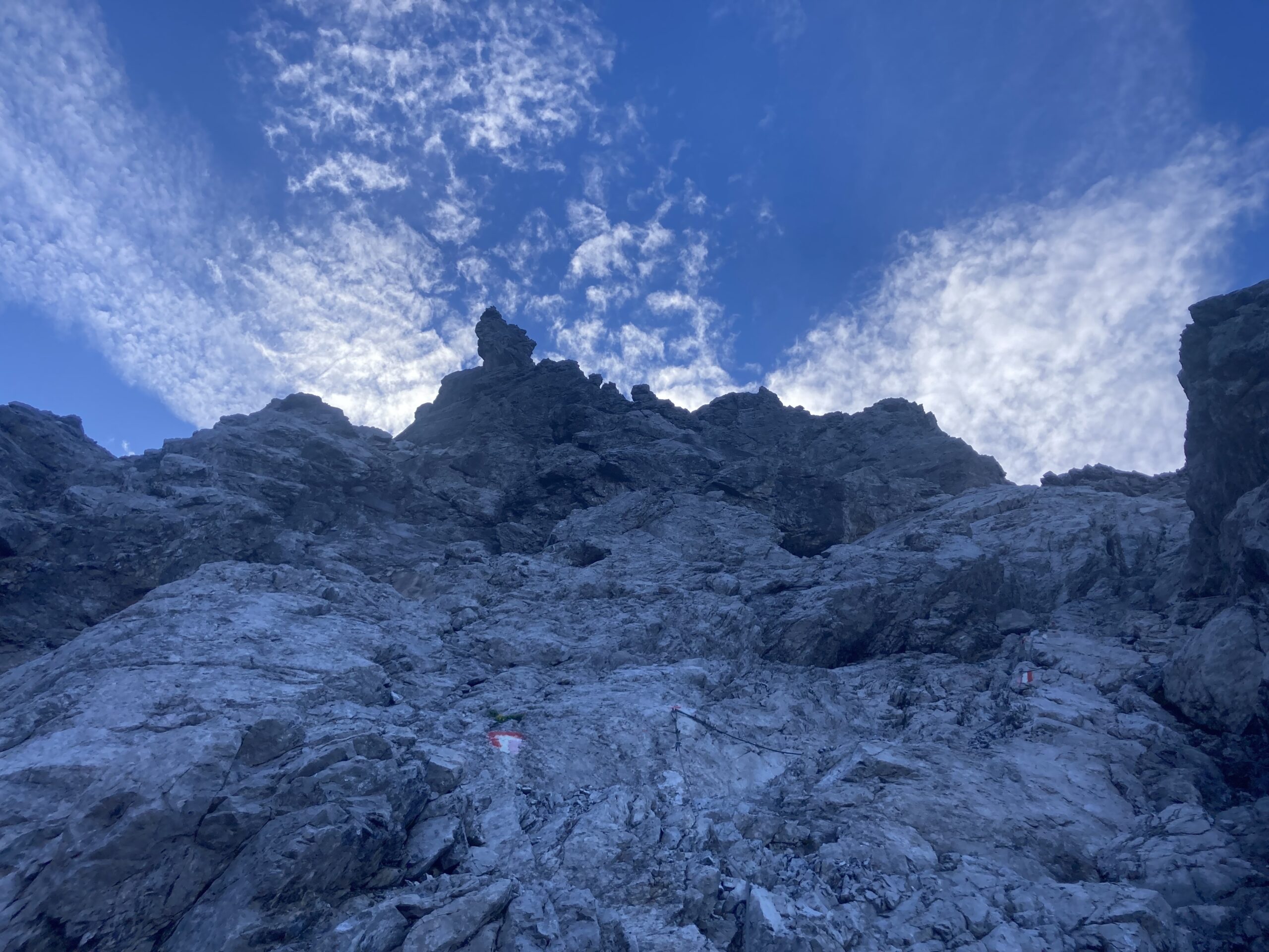 Wecker 6:00 Uhr, Frühstück 6:30 Uhr, Aufbruch 6:54 Uhr, schnell unterwegs bis hoch zum Winterjoch, dort Einstieg in den höhenweg und durch den ersten Teil des Weges, teilweise leichte Kletterei, Schneefeld gequert, durch Schuttfeld hoch bis zur Biwackschachtel am Parseier-Scharte, 2:15h Gehzeit, kurze Pause gemacht, Diskussion ob wir die Eisenspitze mit machen wollen weil so schnell unterwegs, Rucksäcke deponiert und ohne Rucksack Richtung Eisenspitze, steiler Anstieg über Bergrücken, Schuttfeld gequert auf den Eisenkopf, dort am Grat entlang in eine Scharte abgestiegen und von dort wieder ein Schuttfeld hoch (Gämse) zur nächsten Scharte und den mit Fixseilen gesicherten Weg auf den Gipfel der Eisenspitze 2860m, schöne 2er Kletterei, Rückweg nicht über den Grat des Eisenkopfes sondern unterhalb gequert, sehr brüchig alles dort, gefährlich, zurück bei den Rucksäcken weiter auf den Höhenweg, etwas abgestiegen und kurz vor dem gelben Scharterl (Schlüsselstelle) Seil über Schneefeld repariert, interessanter Weg am Hang, immer mal weggerutscht, schmal, Geröll, Schneefeld seilversichert, kein Problem, Scharterl hoch gekletter auch unkritisch, dann Aufstieg zum Dawinkopf, ein bisschen am Grat entlang, oben schöne Kletterei, Gipfel Dawinkopf 2970m, Pause gemacht, dann weiter Richtung Parseierspitze Abstieg vom Dawinkopf sehr interessant mit Stahlseilen versichert, teilweise ausgesetzt, am Grinner Ferner abgestiegen bzw. durch Schnee runter und durch die Gasillschlucht, ebenfalls Drahtseile und Leitern und Geröllfeld zur Augsburger Hütte, Kaiserschmarrn und alkoholfreies Weizen, Nachmittag auf der Terrassen verbracht, Abendessen sehr spät aber sehr gut, Pastinakensuppe, Kichererbsencurry und Mouse Chocolate, dann schweres Gewitter und starker Regen, wieder Diskussion wegen Aufbruch zur Parseierspitze am nächsten Tag, Thermofrühstück für 6 Uhr bestellt, im Lager im Nebenhaus unter dem Dach geschlafen