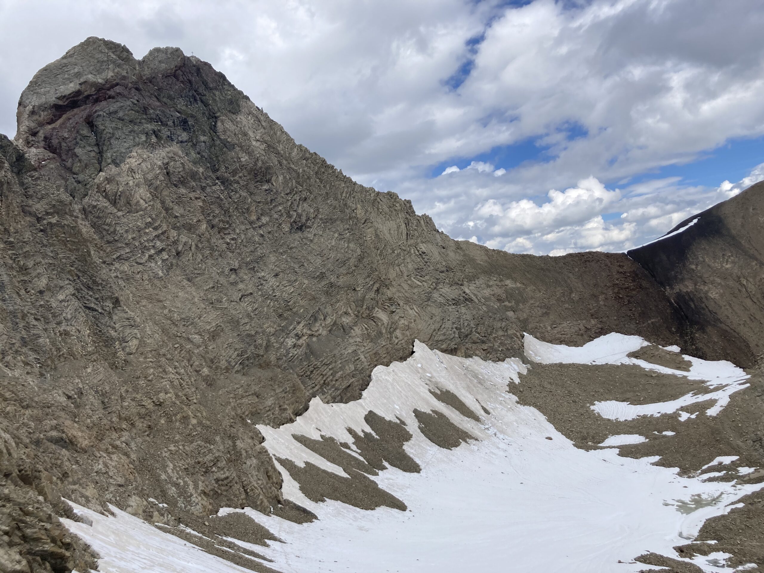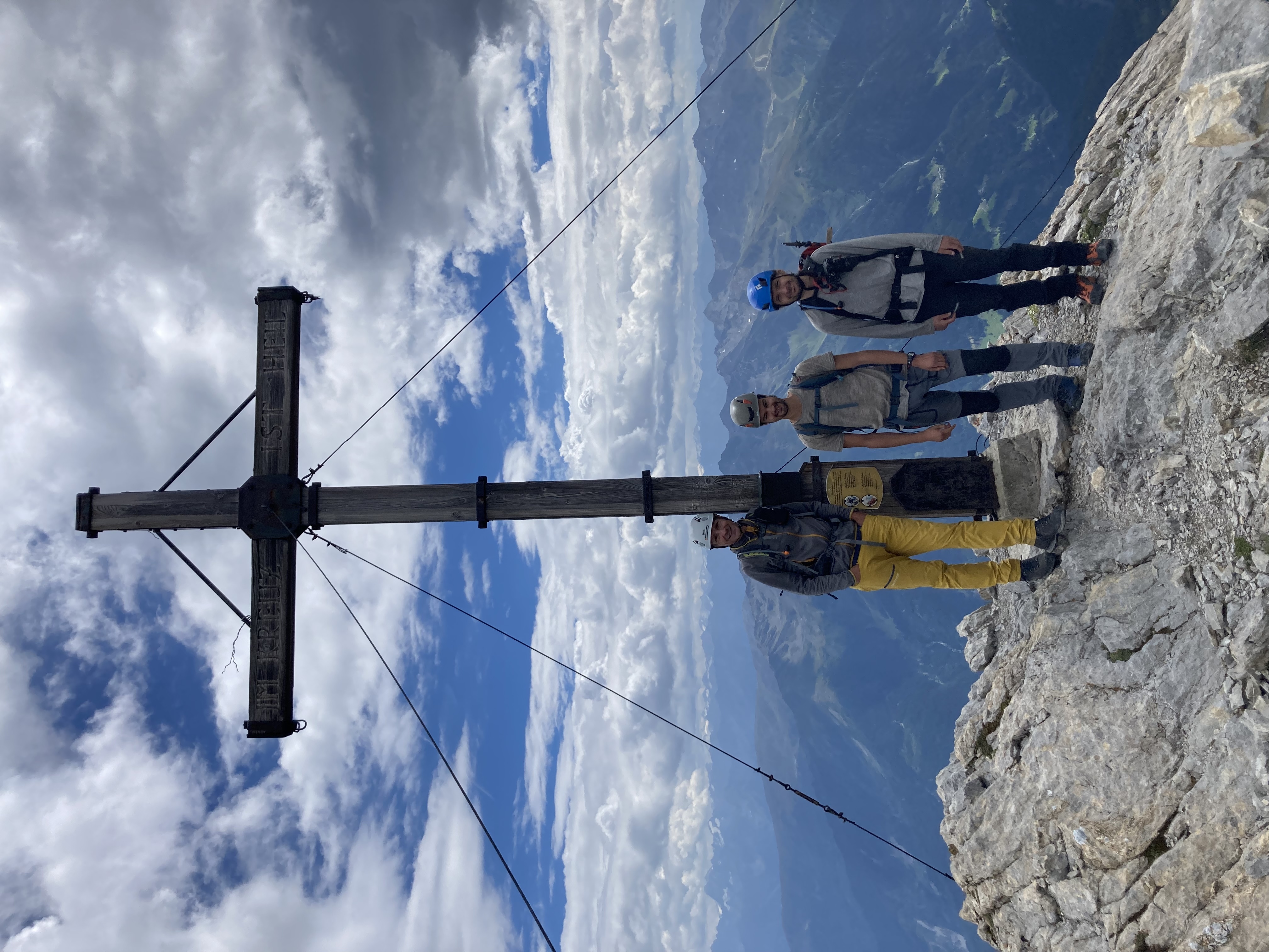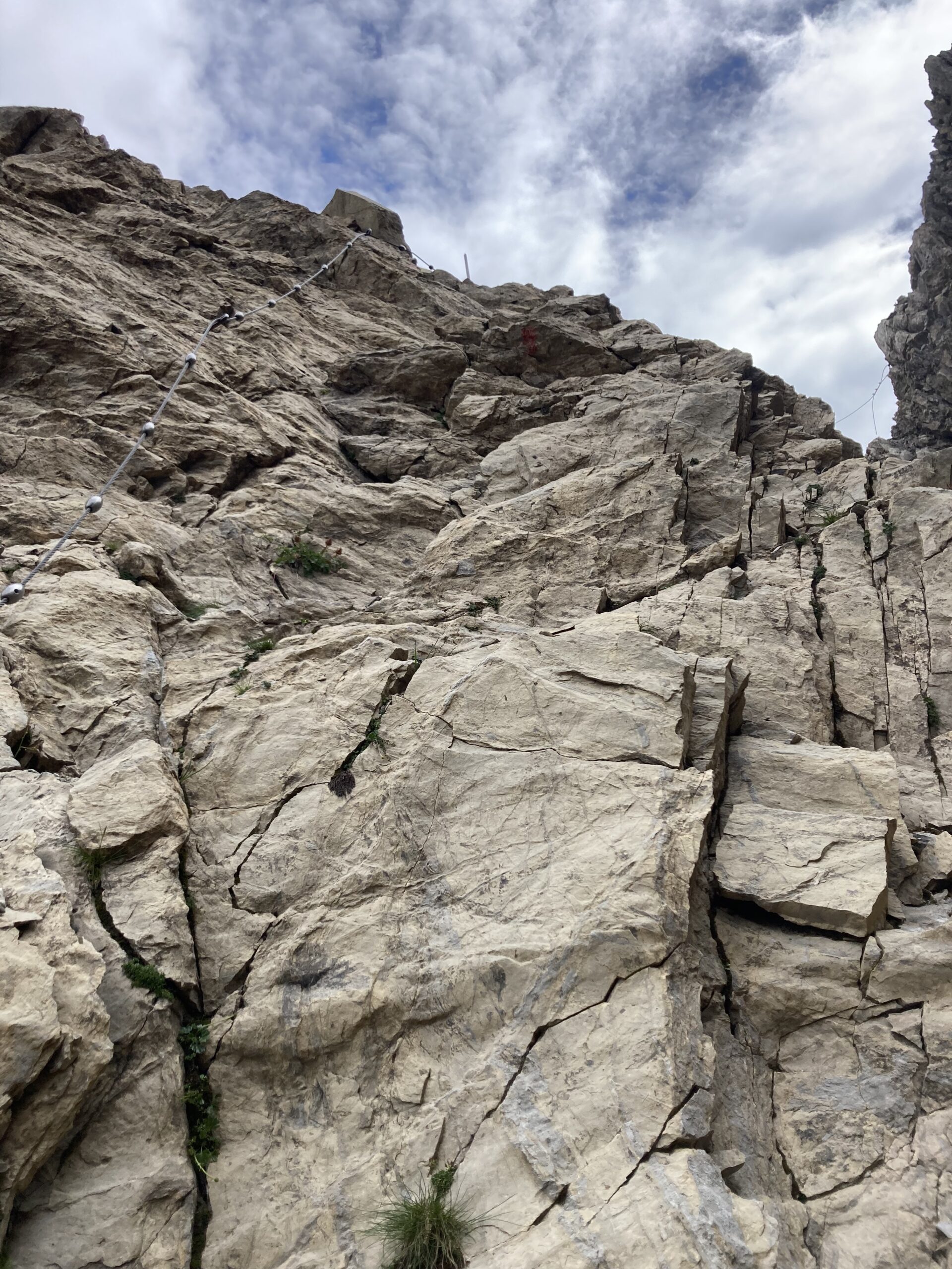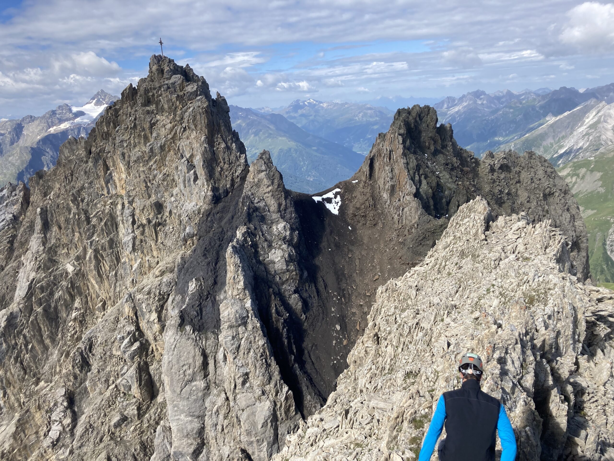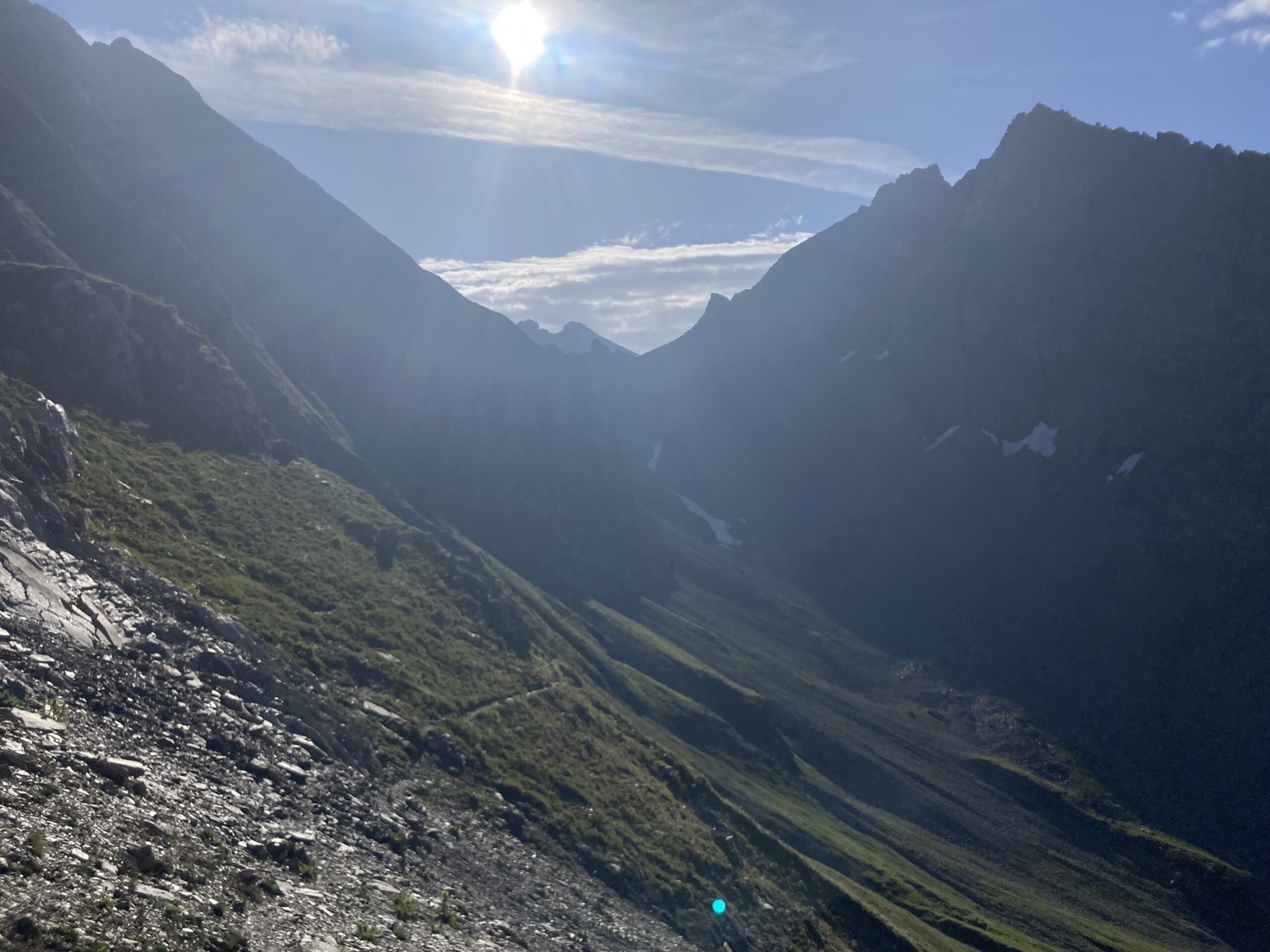 Wecker 6:00 Uhr, Frühstück 6:30 Uhr, Aufbruch 6:54 Uhr, schnell unterwegs bis hoch zum Winterjoch, dort Einstieg in den höhenweg und durch den ersten Teil des Weges, teilweise leichte Kletterei, Schneefeld gequert, durch Schuttfeld hoch bis zur Biwackschachtel am Parseier-Scharte, 2:15h Gehzeit, kurze Pause gemacht, Diskussion ob wir die Eisenspitze mit machen wollen weil so schnell unterwegs, Rucksäcke deponiert und ohne Rucksack Richtung Eisenspitze, steiler Anstieg über Bergrücken, Schuttfeld gequert auf den Eisenkopf, dort am Grat entlang in eine Scharte abgestiegen und von dort wieder ein Schuttfeld hoch (Gämse) zur nächsten Scharte und den mit Fixseilen gesicherten Weg auf den Gipfel der Eisenspitze 2860m, schöne 2er Kletterei, Rückweg nicht über den Grat des Eisenkopfes sondern unterhalb gequert, sehr brüchig alles dort, gefährlich, zurück bei den Rucksäcken weiter auf den Höhenweg, etwas abgestiegen und kurz vor dem gelben Scharterl (Schlüsselstelle) Seil über Schneefeld repariert, interessanter Weg am Hang, immer mal weggerutscht, schmal, Geröll, Schneefeld seilversichert, kein Problem, Scharterl hoch gekletter auch unkritisch, dann Aufstieg zum Dawinkopf, ein bisschen am Grat entlang, oben schöne Kletterei, Gipfel Dawinkopf 2970m, Pause gemacht, dann weiter Richtung Parseierspitze Abstieg vom Dawinkopf sehr interessant mit Stahlseilen versichert, teilweise ausgesetzt, am Grinner Ferner abgestiegen bzw. durch Schnee runter und durch die Gasillschlucht, ebenfalls Drahtseile und Leitern und Geröllfeld zur Augsburger Hütte, Kaiserschmarrn und alkoholfreies Weizen, Nachmittag auf der Terrassen verbracht, Abendessen sehr spät aber sehr gut, Pastinakensuppe, Kichererbsencurry und Mouse Chocolate, dann schweres Gewitter und starker Regen, wieder Diskussion wegen Aufbruch zur Parseierspitze am nächsten Tag, Thermofrühstück für 6 Uhr bestellt, im Lager im Nebenhaus unter dem Dach geschlafen