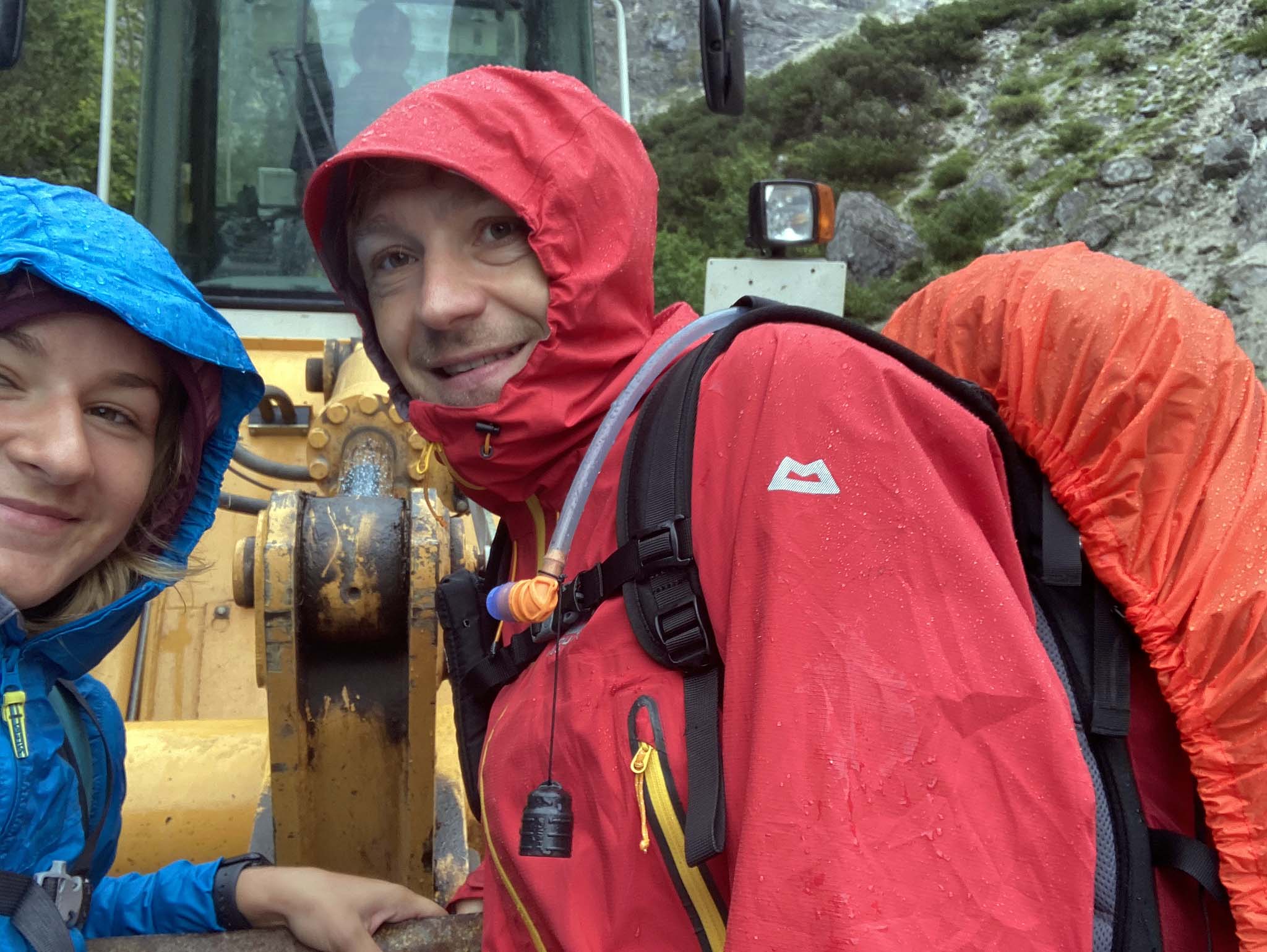 Wir mussten also wohl oder übel weiter absteigen. Zu allem Überfluss begann es nun auch zu regnen. Wir hatten aber dann doch noch Glück und nach ca. 10 Minuten kam ein Bauer mit seinem Radlader aus einer Seitenstraße. Dieser hat uns dann auf seiner Schaufel ca. 3,5 Kilometer und fast 500 hm bis nach Absam zum Parkplatz mitgenommen.