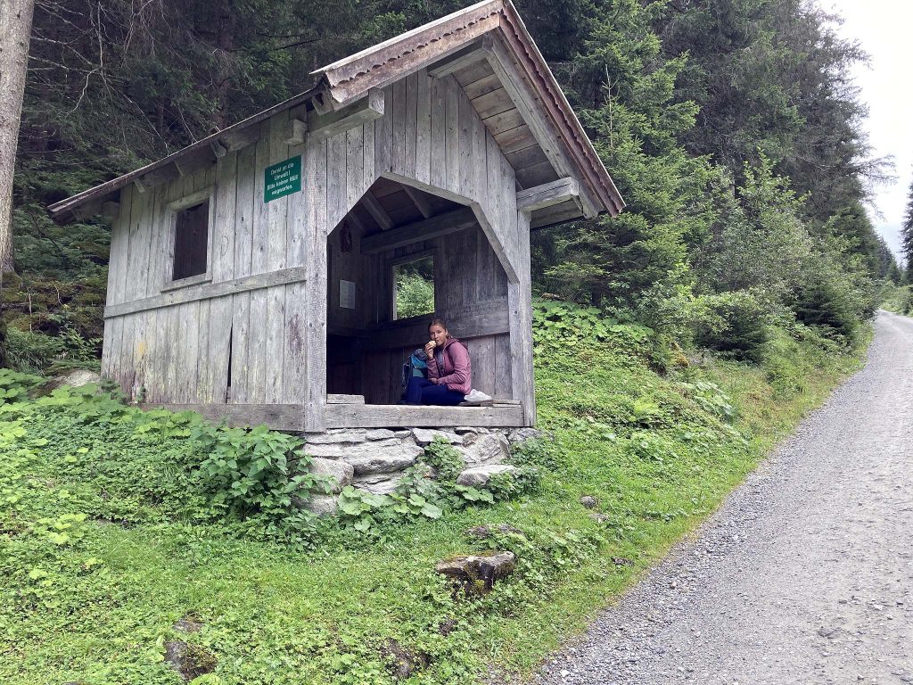 Auf einer Mautstraße ging es beständig bergan. Die Straße wurde aber auch immer wieder von Autos befahren. Kim hat ein derartiges Tempo vorgelegt, sodass wir uns nach kurzer Zeit aus den Augen verloren haben. Dann hat uns auch noch ein kurzer Regenschauer erwischt. Nach einem drittel der Strecke haben wir an einem Brotzeithäuschen mit Wildkamera dann eine kurze Pause mit Brotzeit eingelegt.