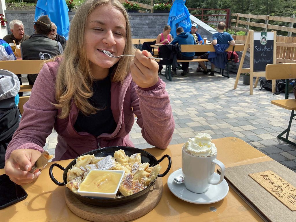 Das zweite Drittel des Aufstiegs haben wir dann bei besserem Wetter und gemeinsam im Wettkampftempo bewältigt und sind etwas außer Atem an der Kemater Alm angekommen. Hier haben wir uns endlich den ersten Kaiserschmarrn und dazu Heiße Schokolade mit Schlag gegönnt.