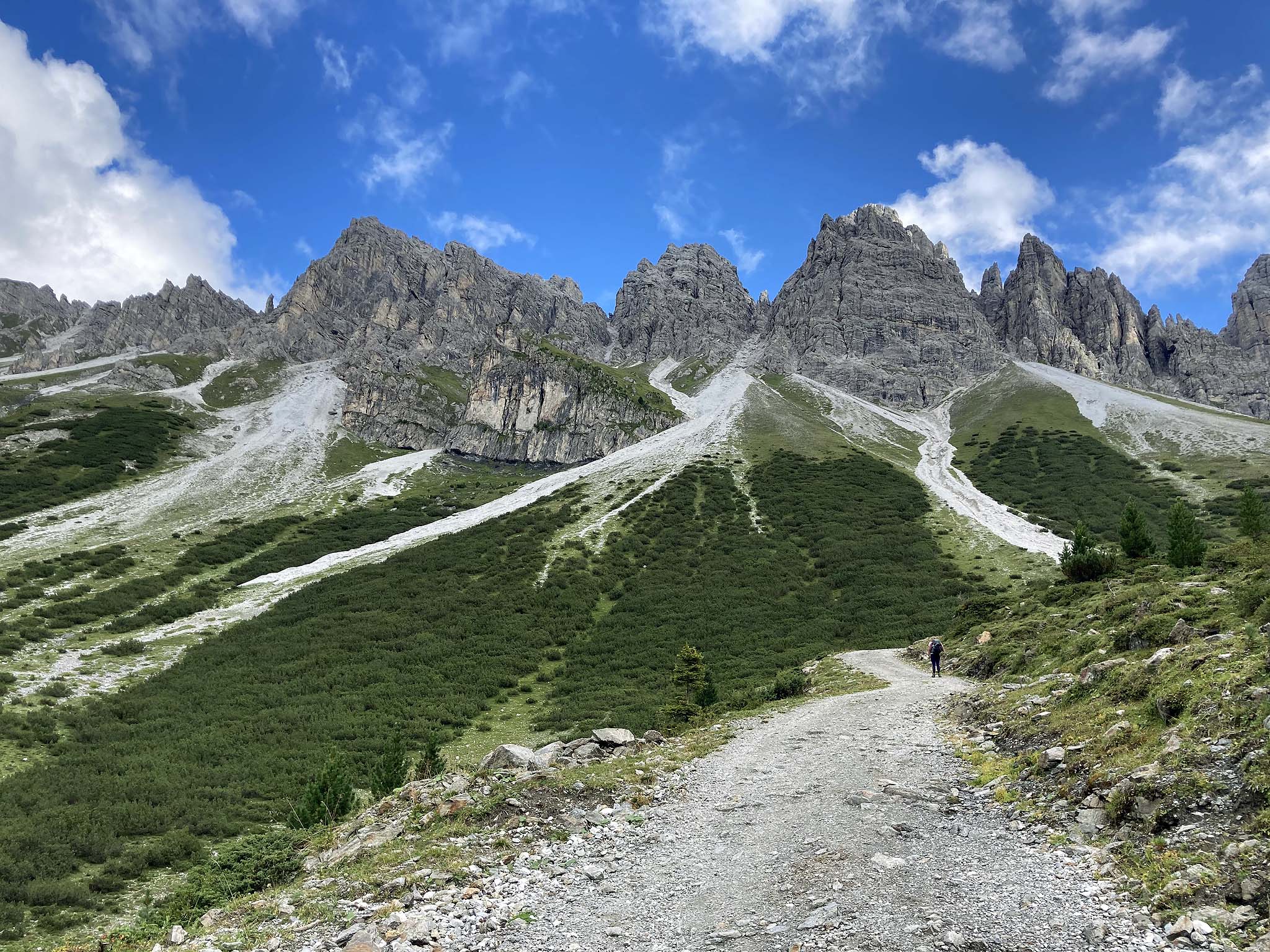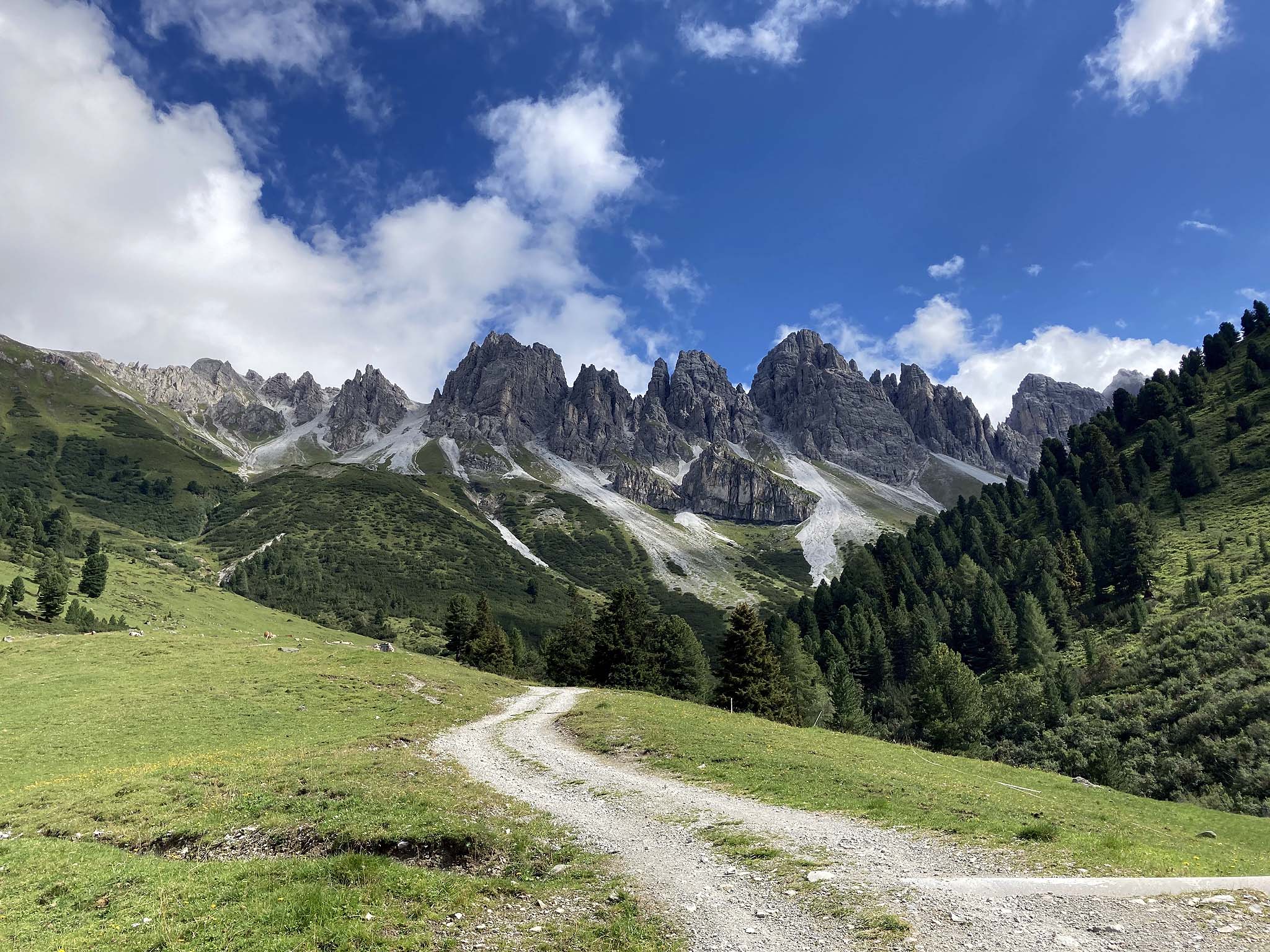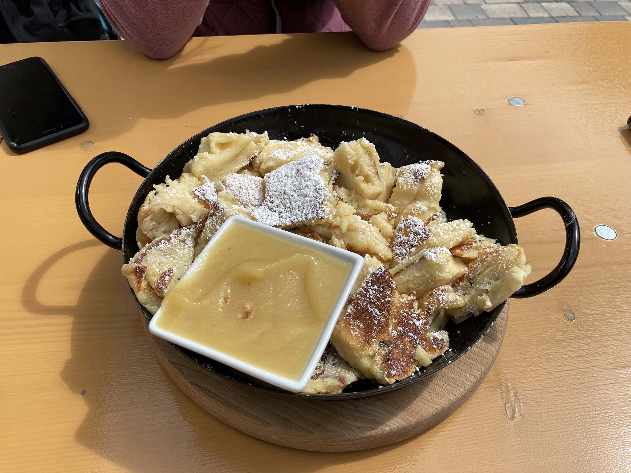 Das zweite Drittel des Aufstiegs haben wir dann bei besserem Wetter und gemeinsam im Wettkampftempo bewältigt und sind etwas außer Atem an der Kemater Alm angekommen. Hier haben wir uns endlich den ersten Kaiserschmarrn und dazu Heiße Schokolade mit Schlag gegönnt.