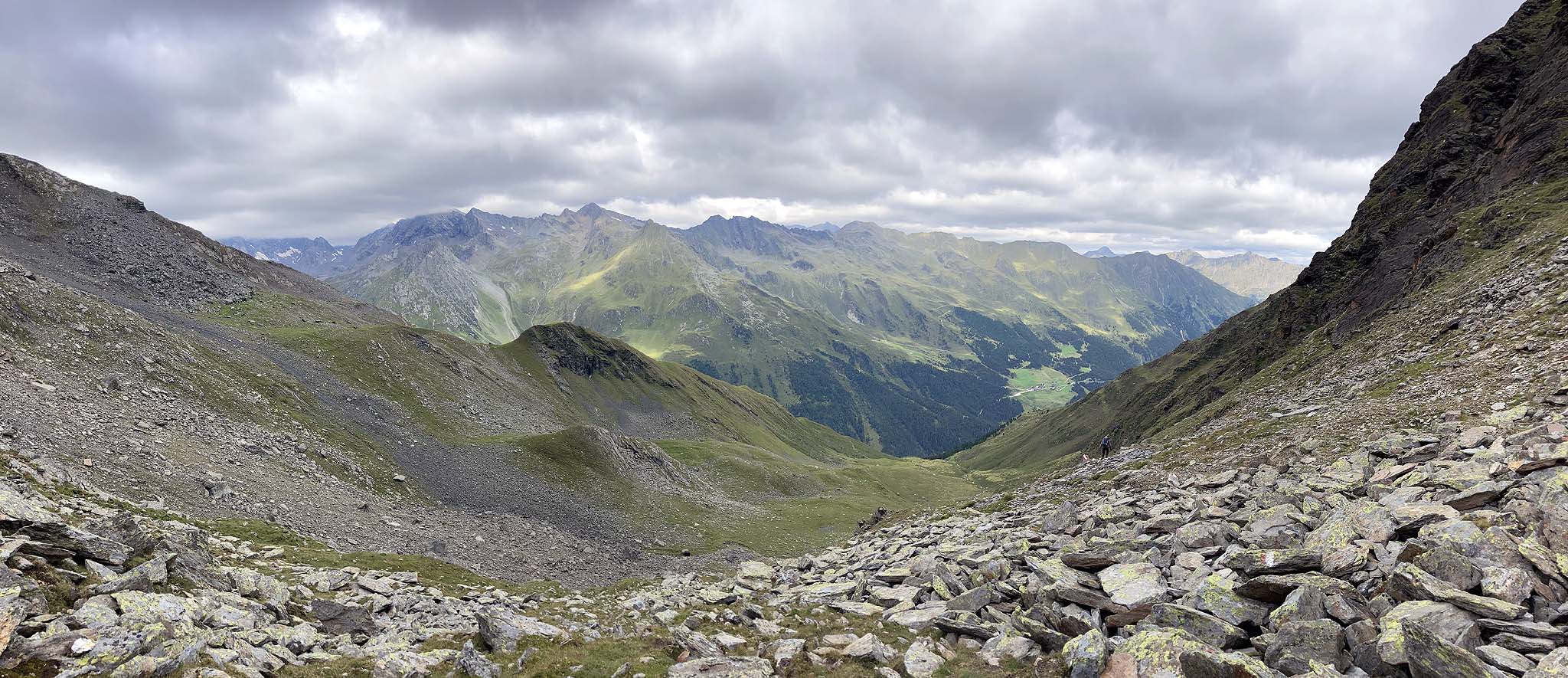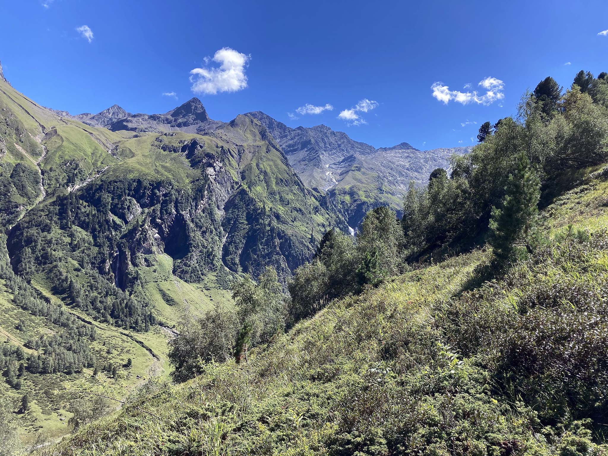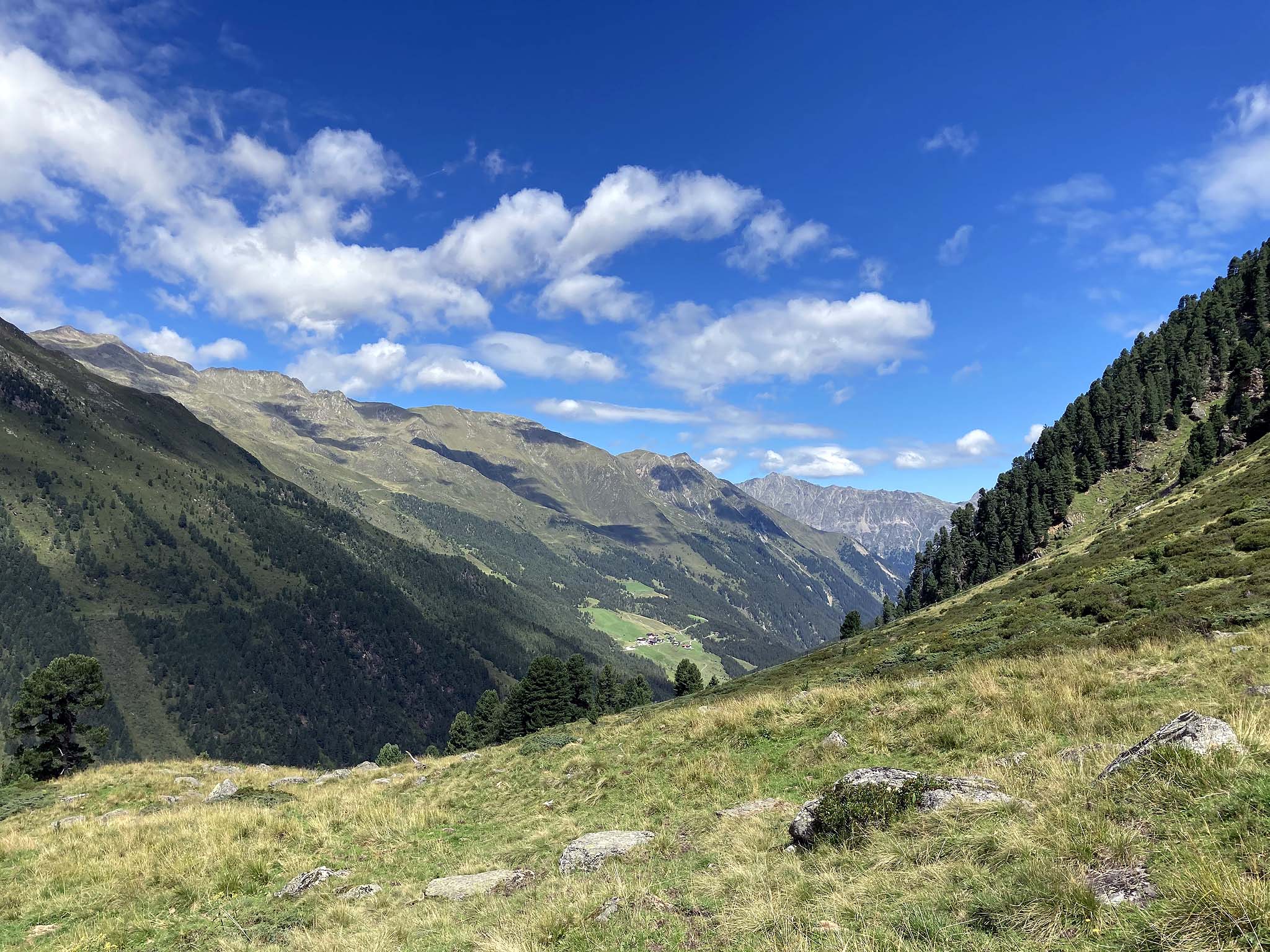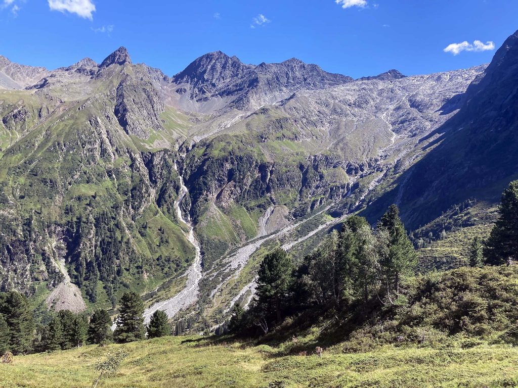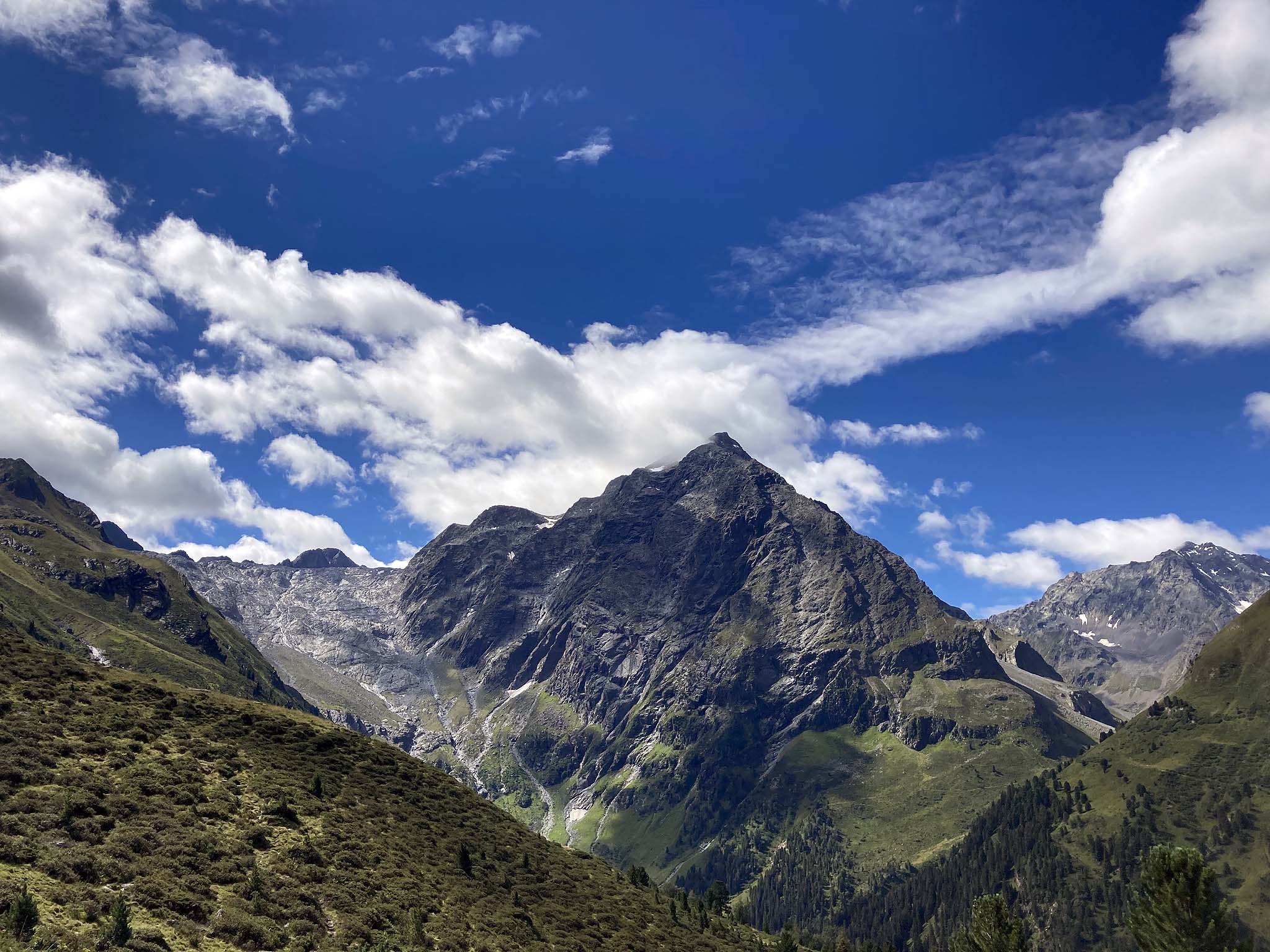 Erst beim Abstieg nach Lüsens sind die Wolken aufgerissen und die Sonne ist endlich durchgekommen und es hat sich ein herrlicher Blick auf den Lüsener Fernerkogel eröffnet.