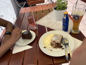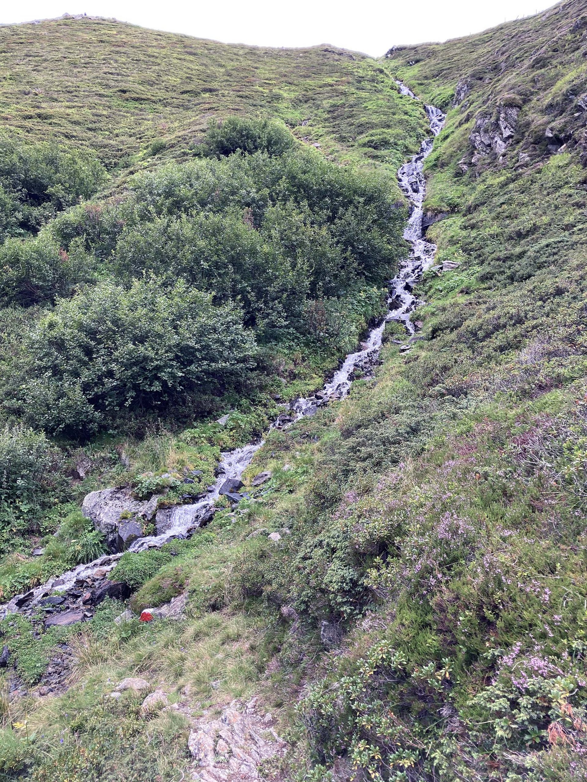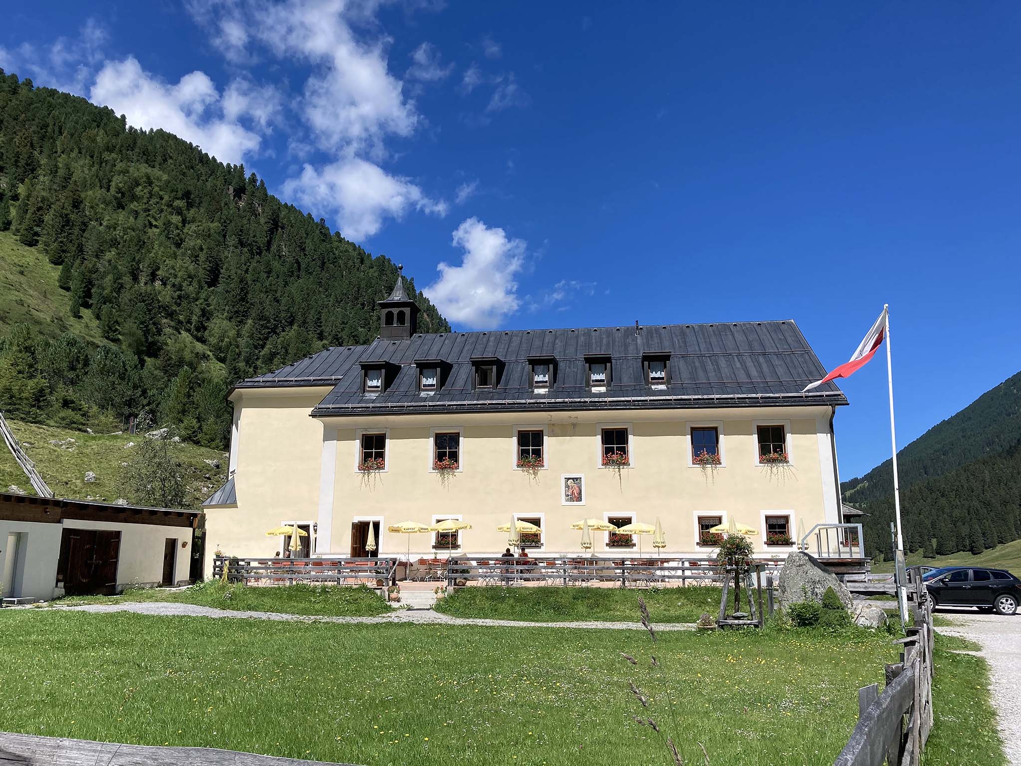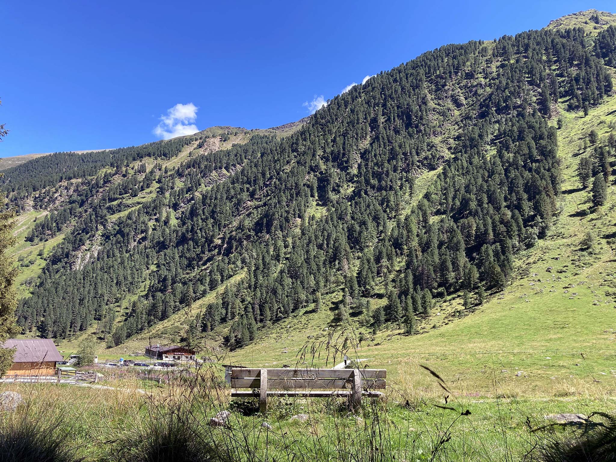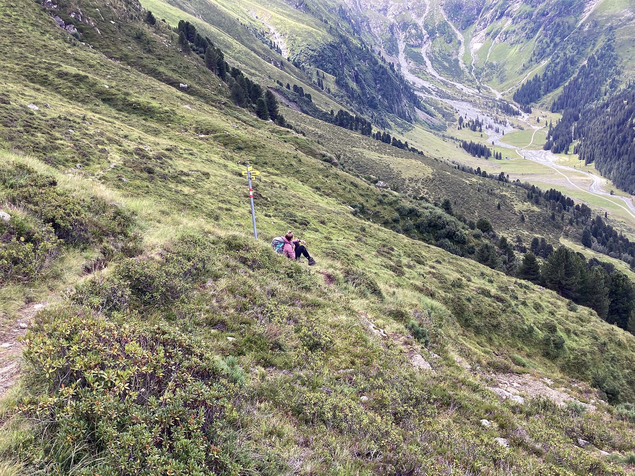 Nach den 1000 hm Abstieg haben wir uns erst einmal im Alpengasthof Lüsens niedergelassen und einen Schokokuchen und einen Apfelstrudel mit Vanillesoße genossen. Weder der Kuchen, noch der Apfelstrudel und schon gar nicht der holländische Kellner haben hier einen guten Eindruck hinterlassen.