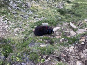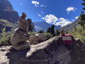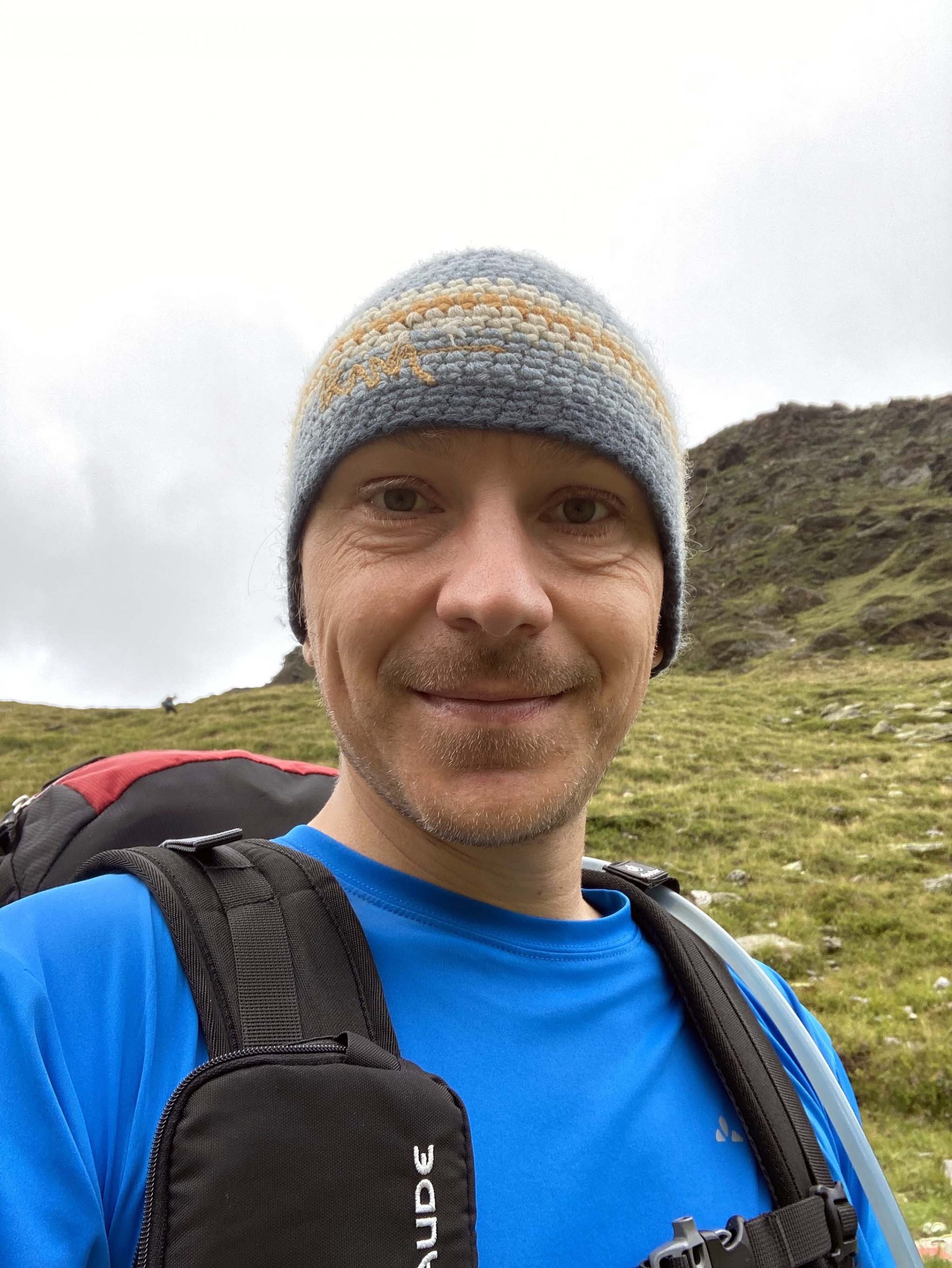 Über Nacht war Kims Trinkblase am Schlauch-Anschluss ausgelaufen und ihr Rucksack nass geworden. Martin hat dann erst mal Kims nassen Rucksack für die erste Stunde tragen müssen.