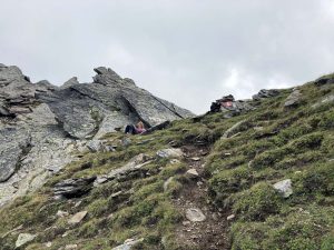 Über den Inneren Bremstall ging es ordentlich hoch zum Hochgrafljoch, wo wir im Windschatten erst mal unsere Brotzeit gemacht haben. Das Wetter hat sich noch nicht gemäß dem Wetterbericht entwickelt. Es war noch relativ bewölkt und es wehte ein kalter Wind.
