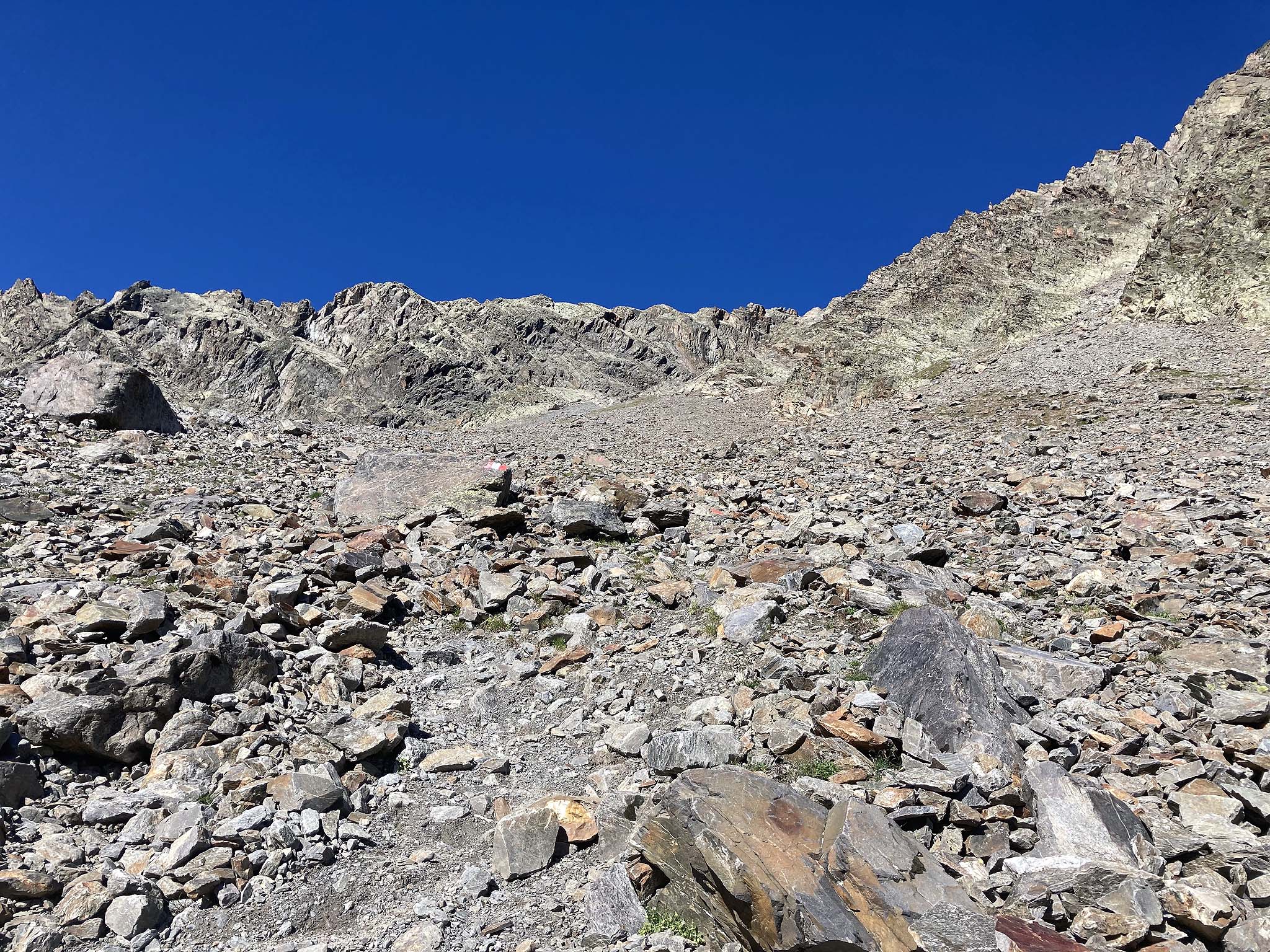 Der Weg verlief zunächst ohne wesentlichen Höhenunterschied weiter in das Tal hinein. Nach gut 2 Kilometern ging es dann aber ordentlich bergan durch ein Kar mit riesigen Blöcken.