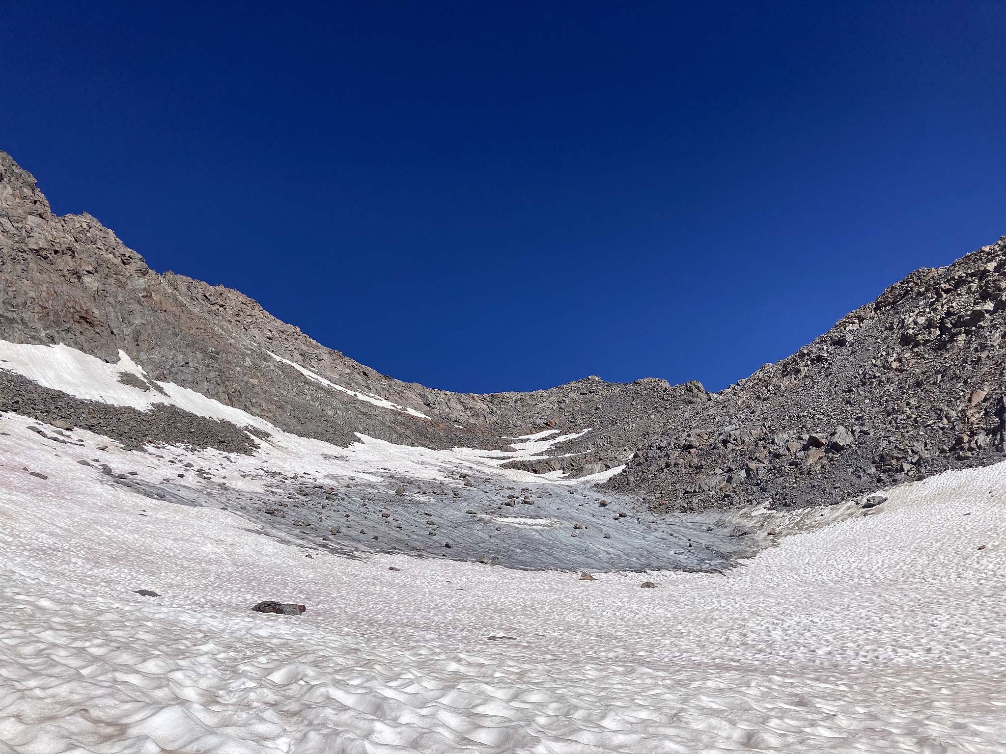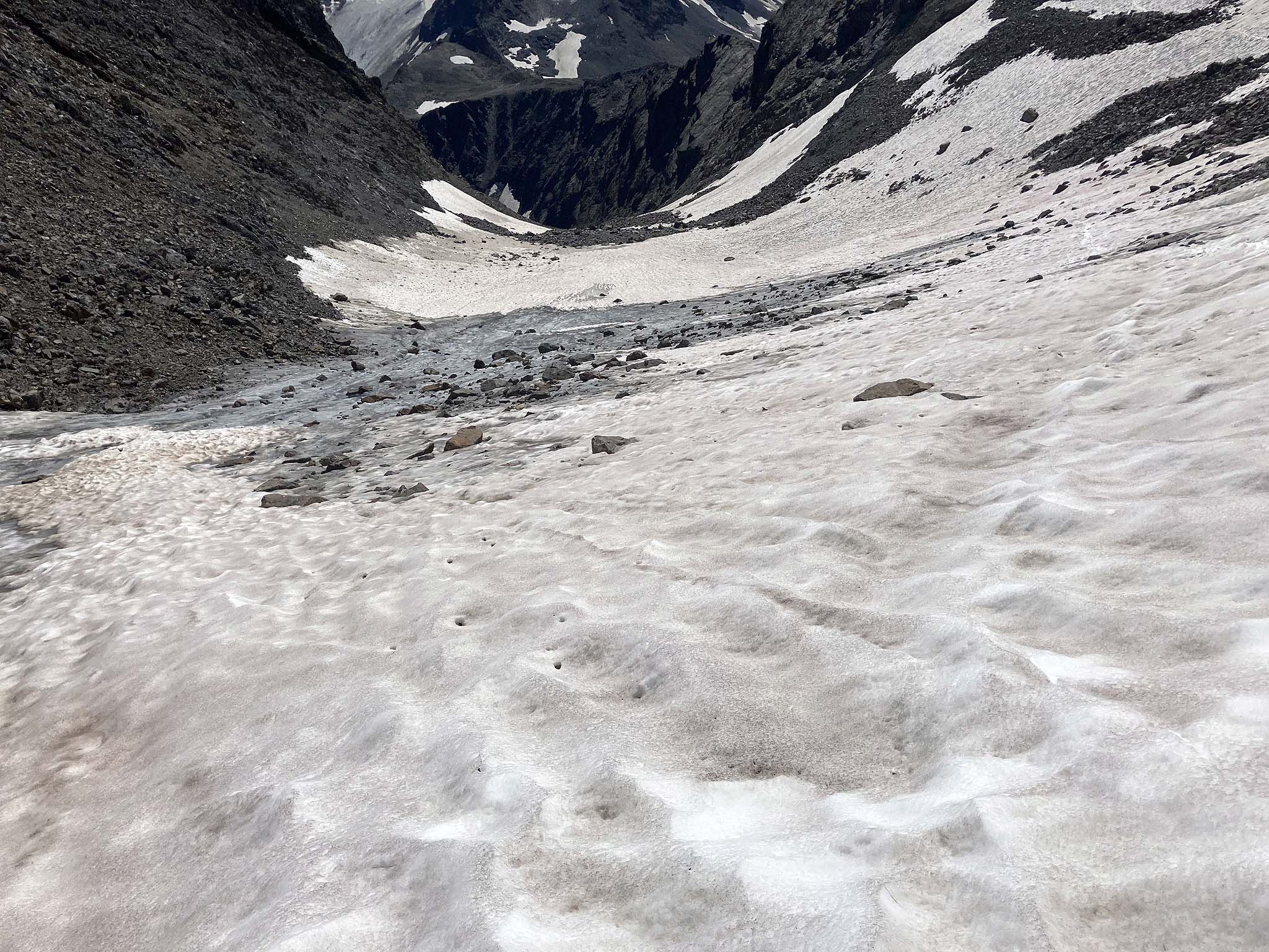 Ab hier musste man ohne Markierung weiter durch das freie Gelände über riesige Steinblöcke gehen bis man schließlich an der nächsten Geländestufe zum verbliebenen Gletscher bzw. dessen Schneefelder blicken konnte.