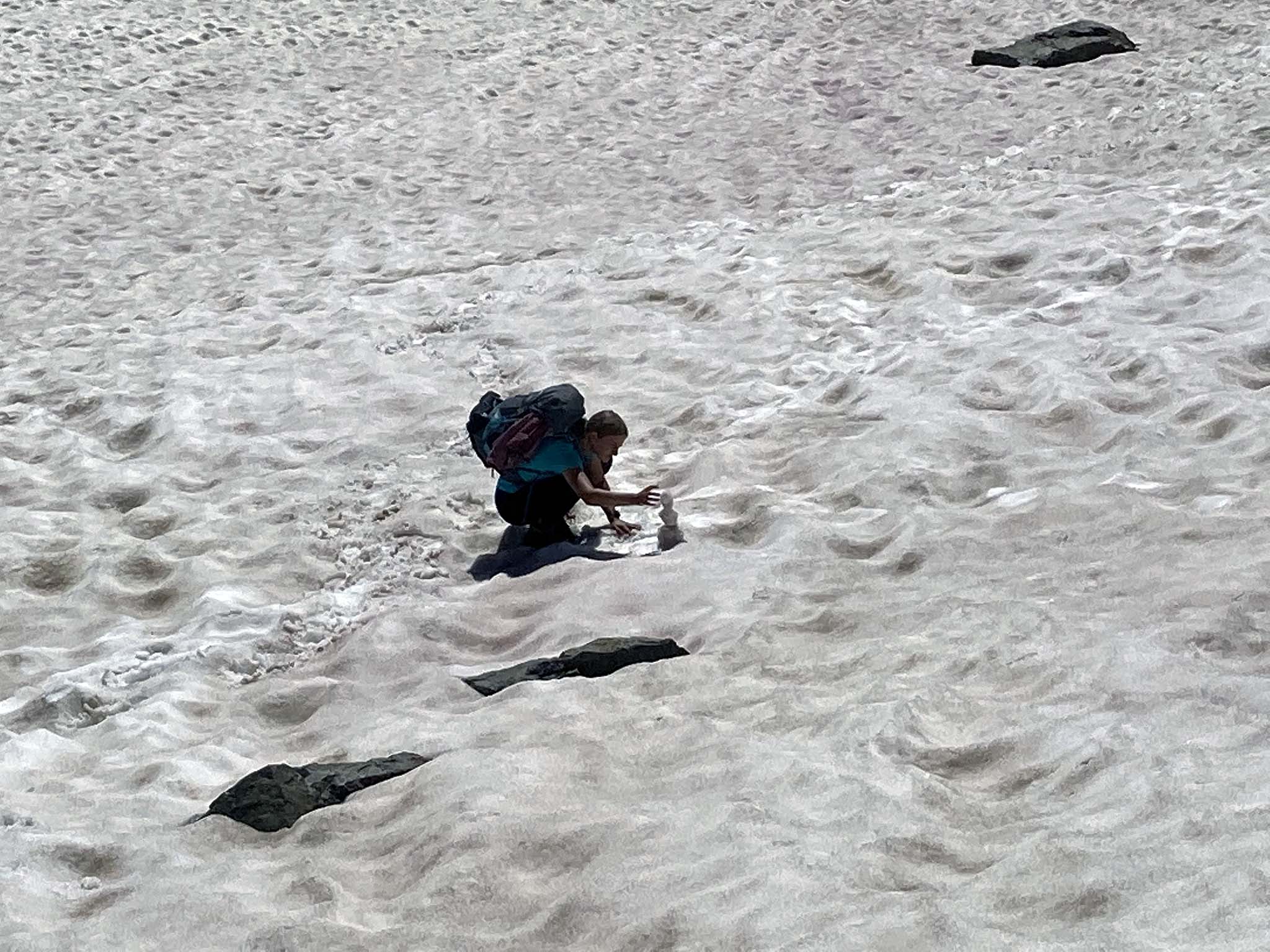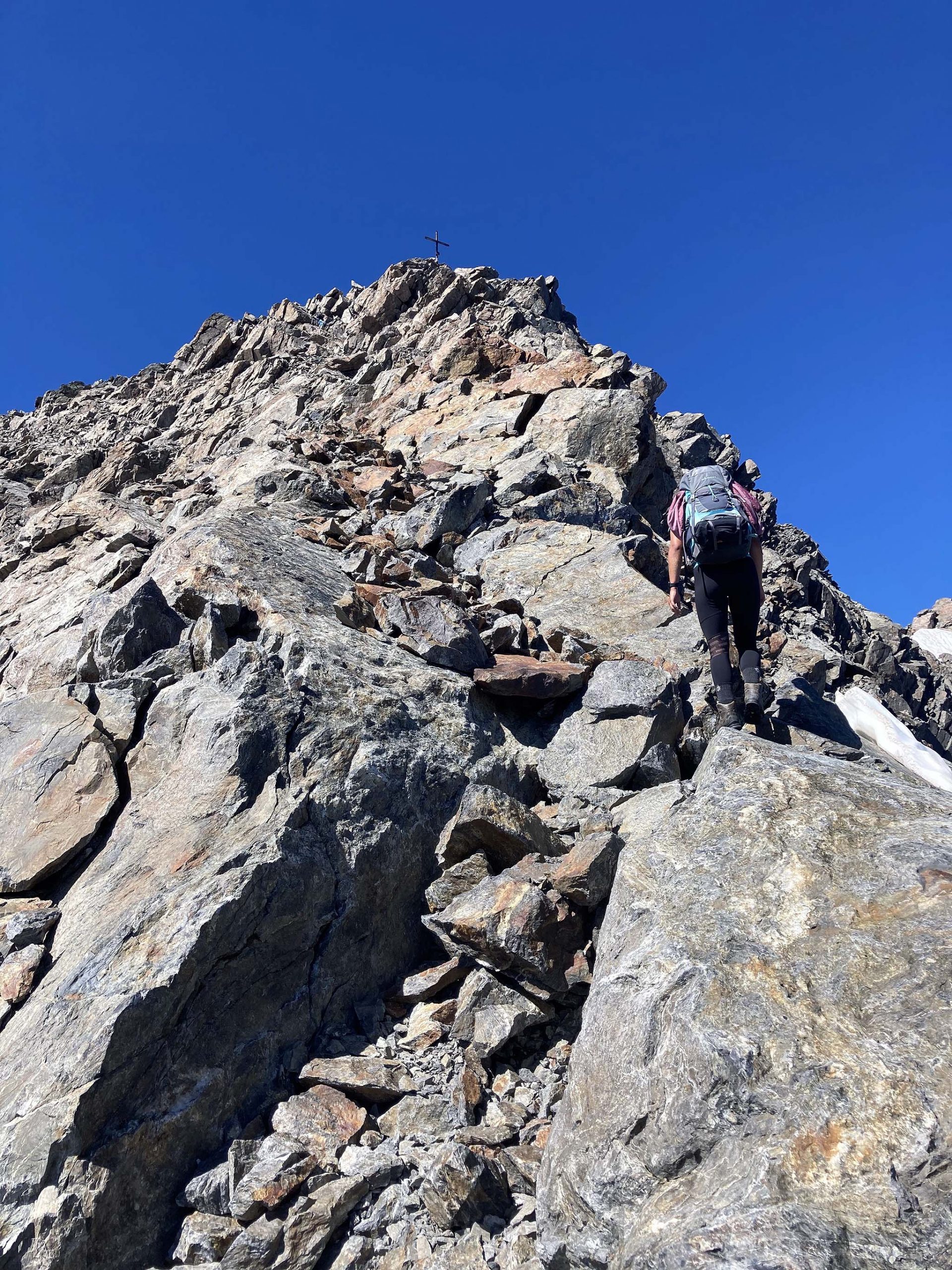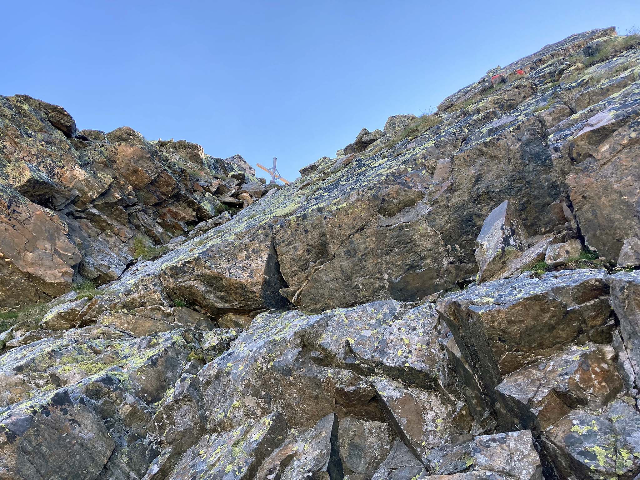 Über diese Schneefelder sind wir dann schließlich zum Gipfel-Aufschwung gelangt. Hier konnte man herrlich über die riesigen Felsblöcke bis zum Gipfelkreuz klettern.