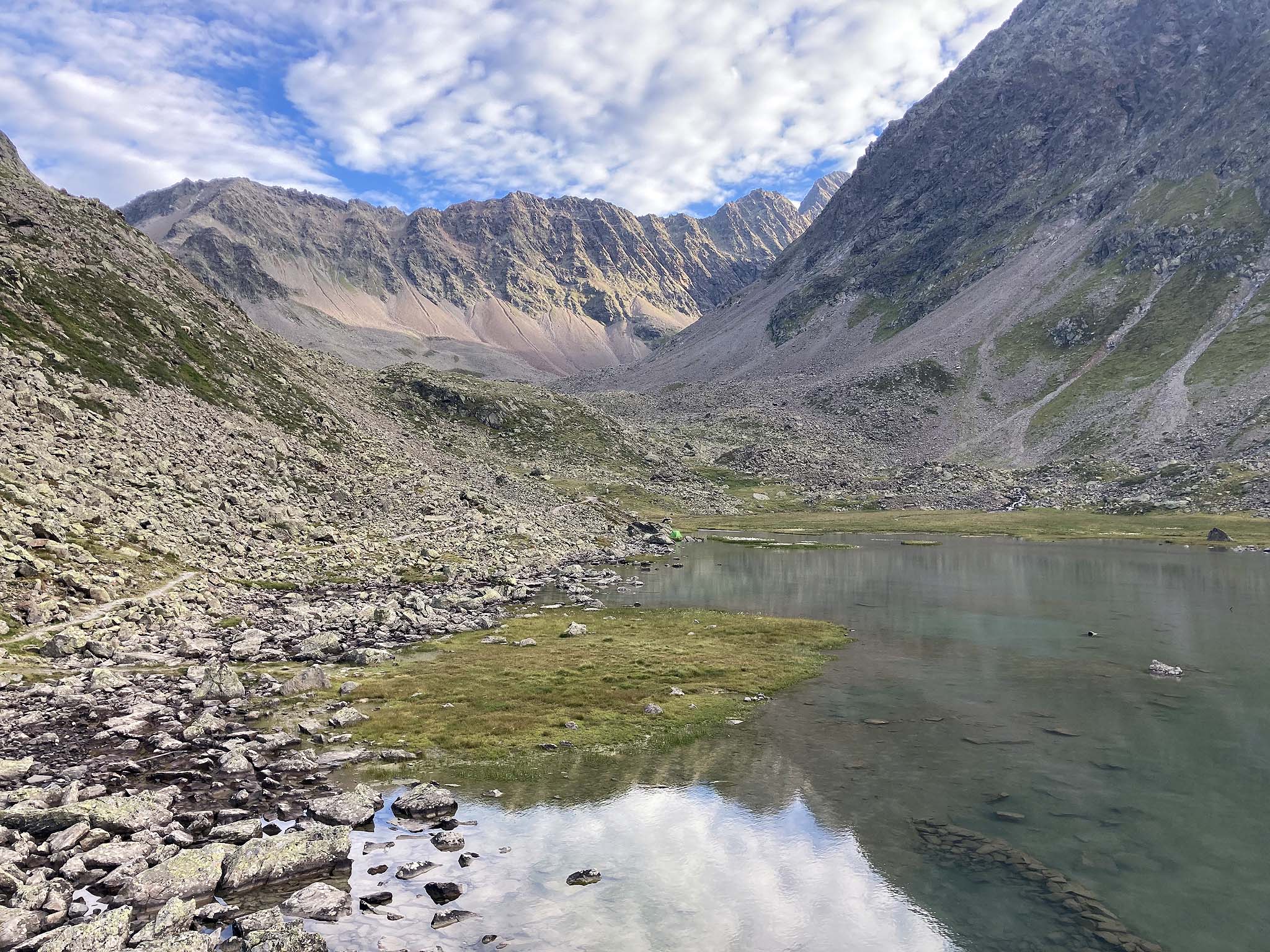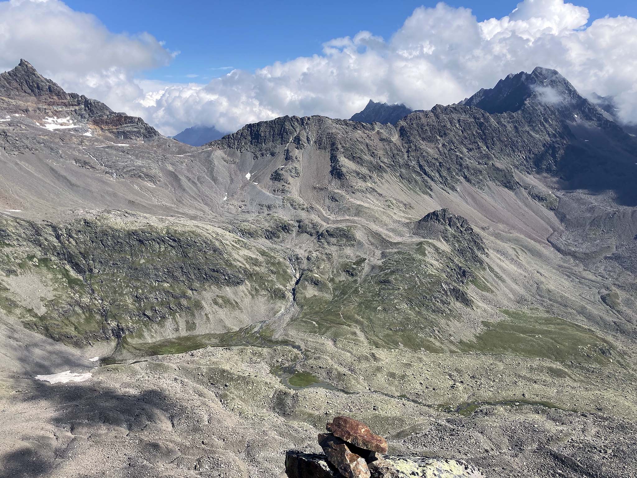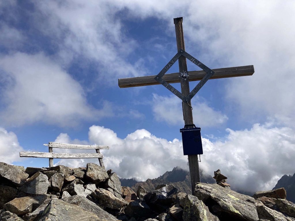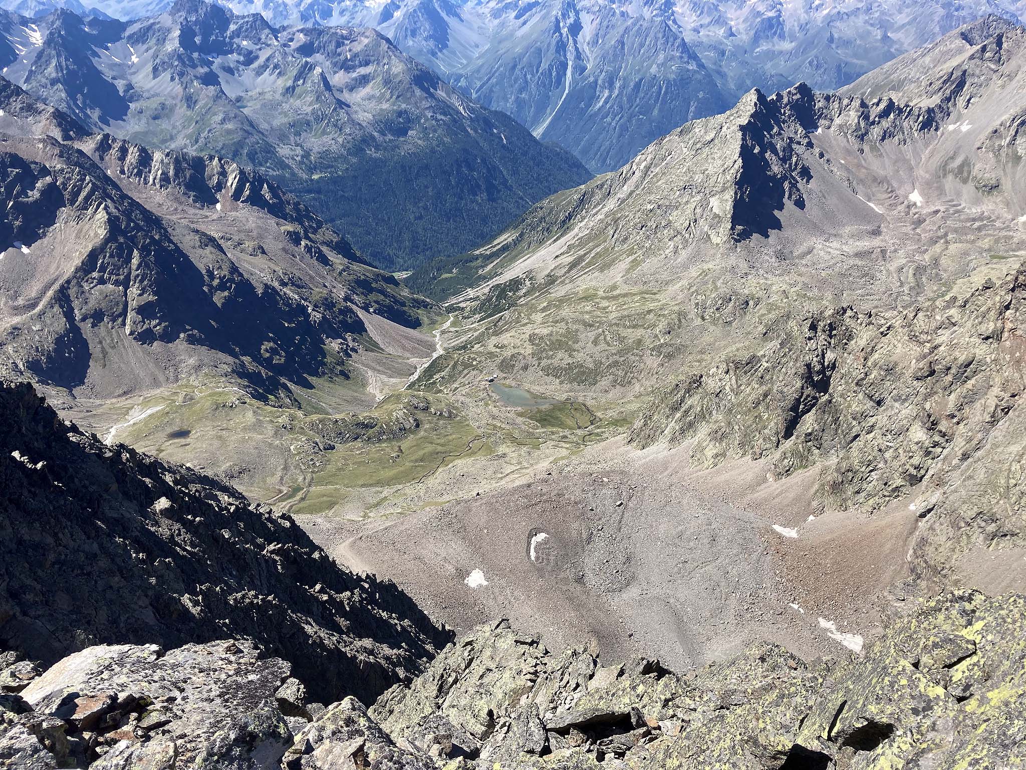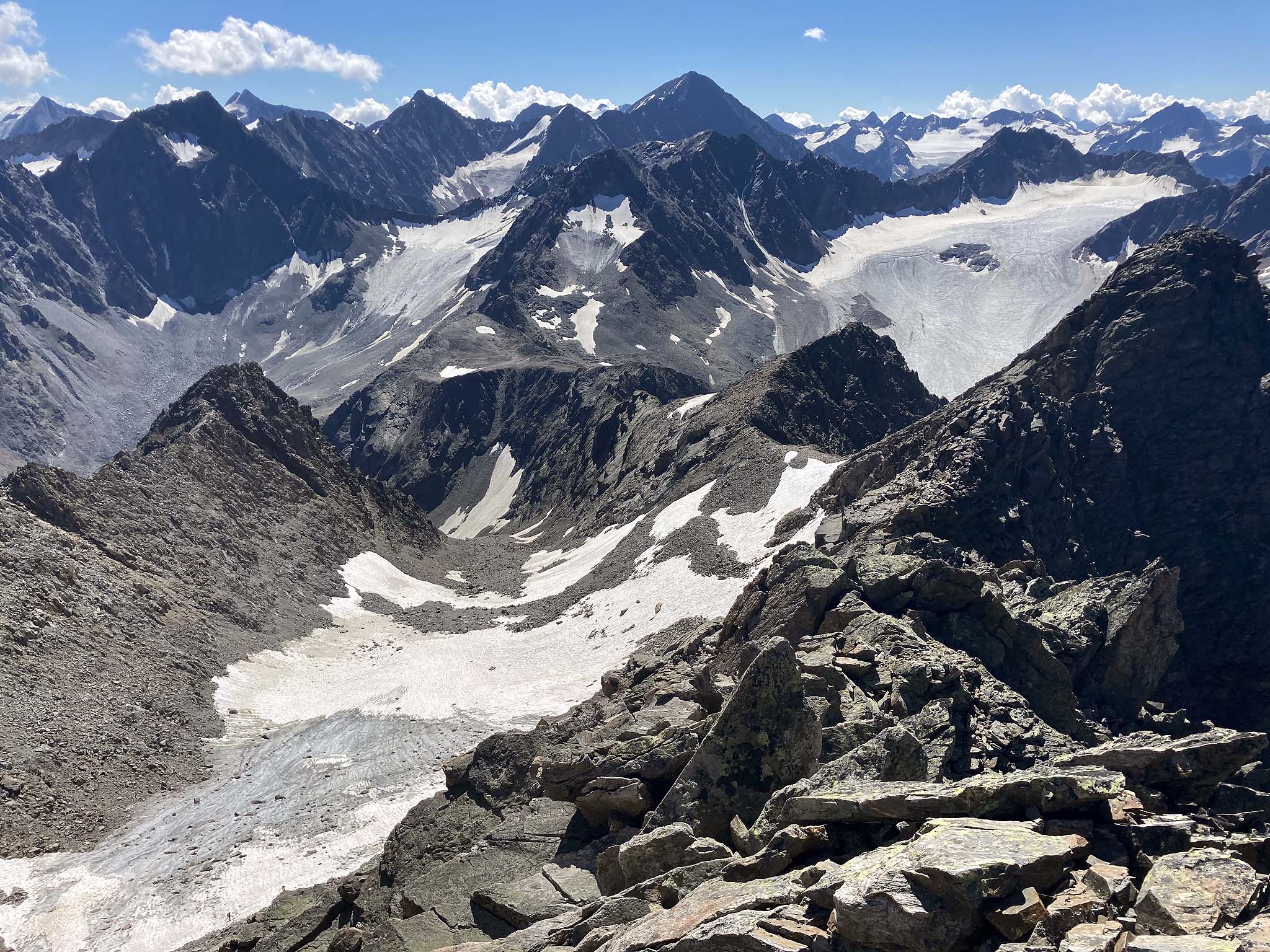 Vom Gipfel aus bot sich bei optimalen Wetter-Bedingungen eine überwältigende Sicht über die Stubaier- und Ötztaler Alpen im Süden. Hier wurde wieder eine ausführliche Pause mit Nickerchen gemacht. Es war auch schon unser Ziel, die Winnebachseehütte zu sehen.