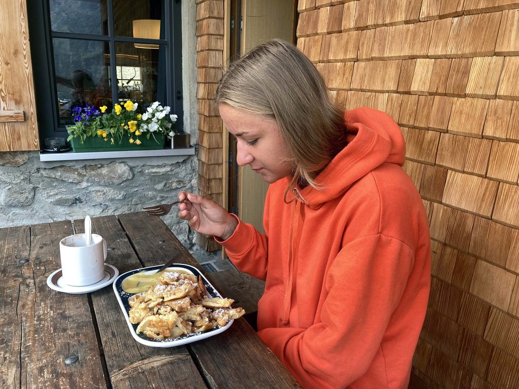 Nach der Rückkehr wurde Kim dann gegen 12 Uhr geweckt. Zum Frühstück gab es dann einen Kaiserschmarrn mit Kakao mit Schlag.