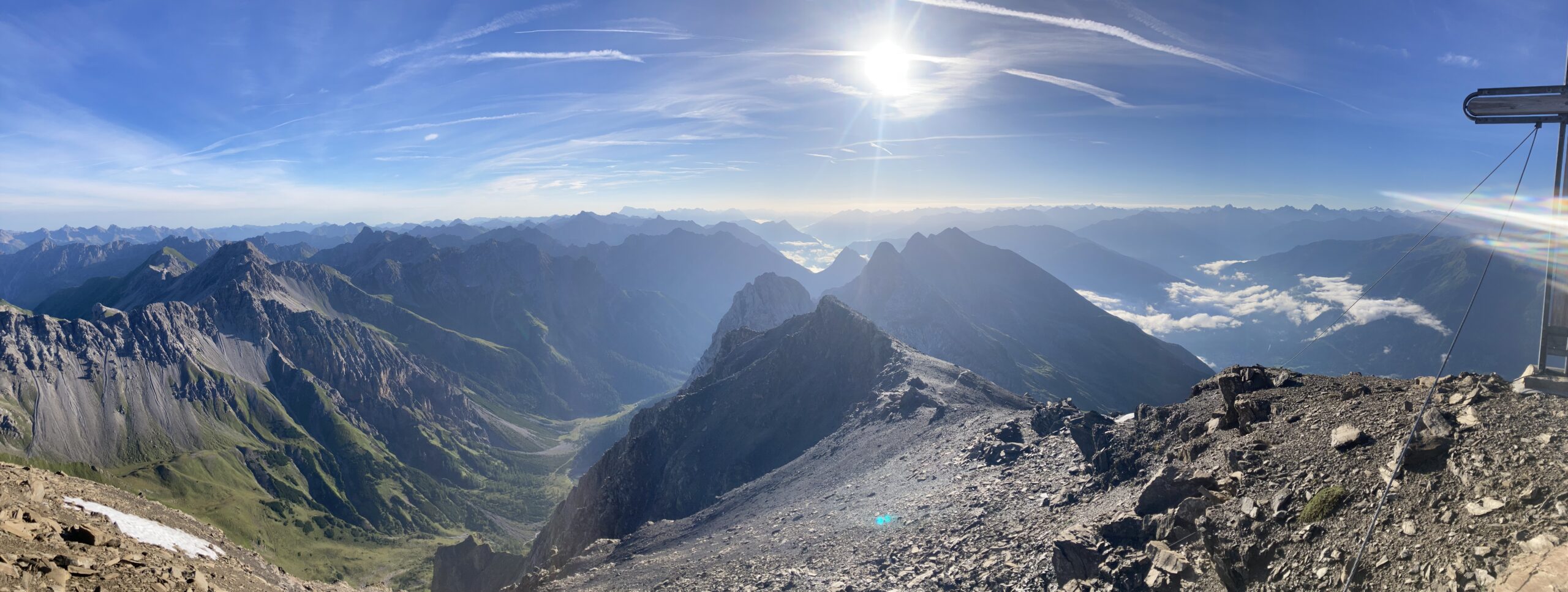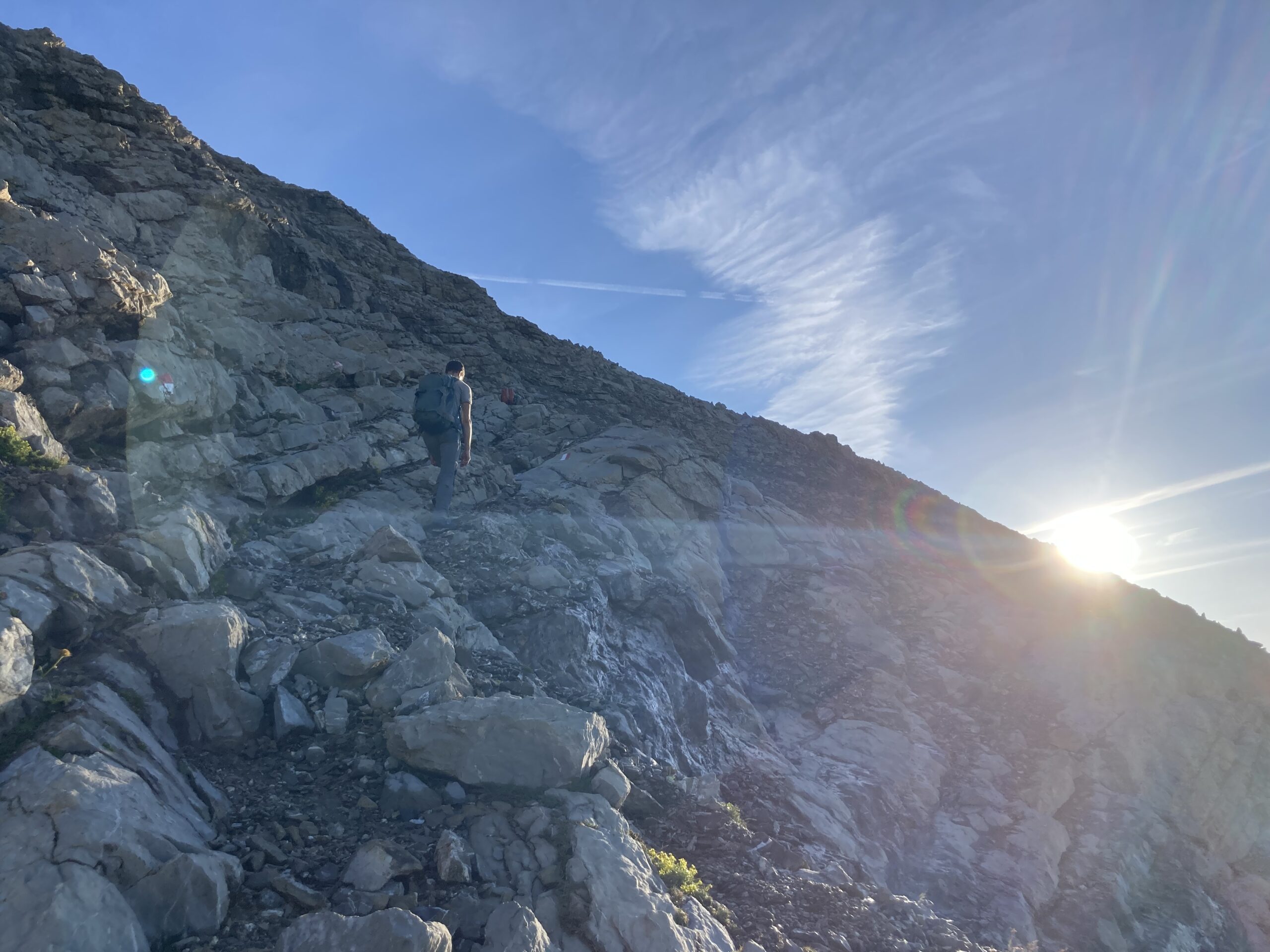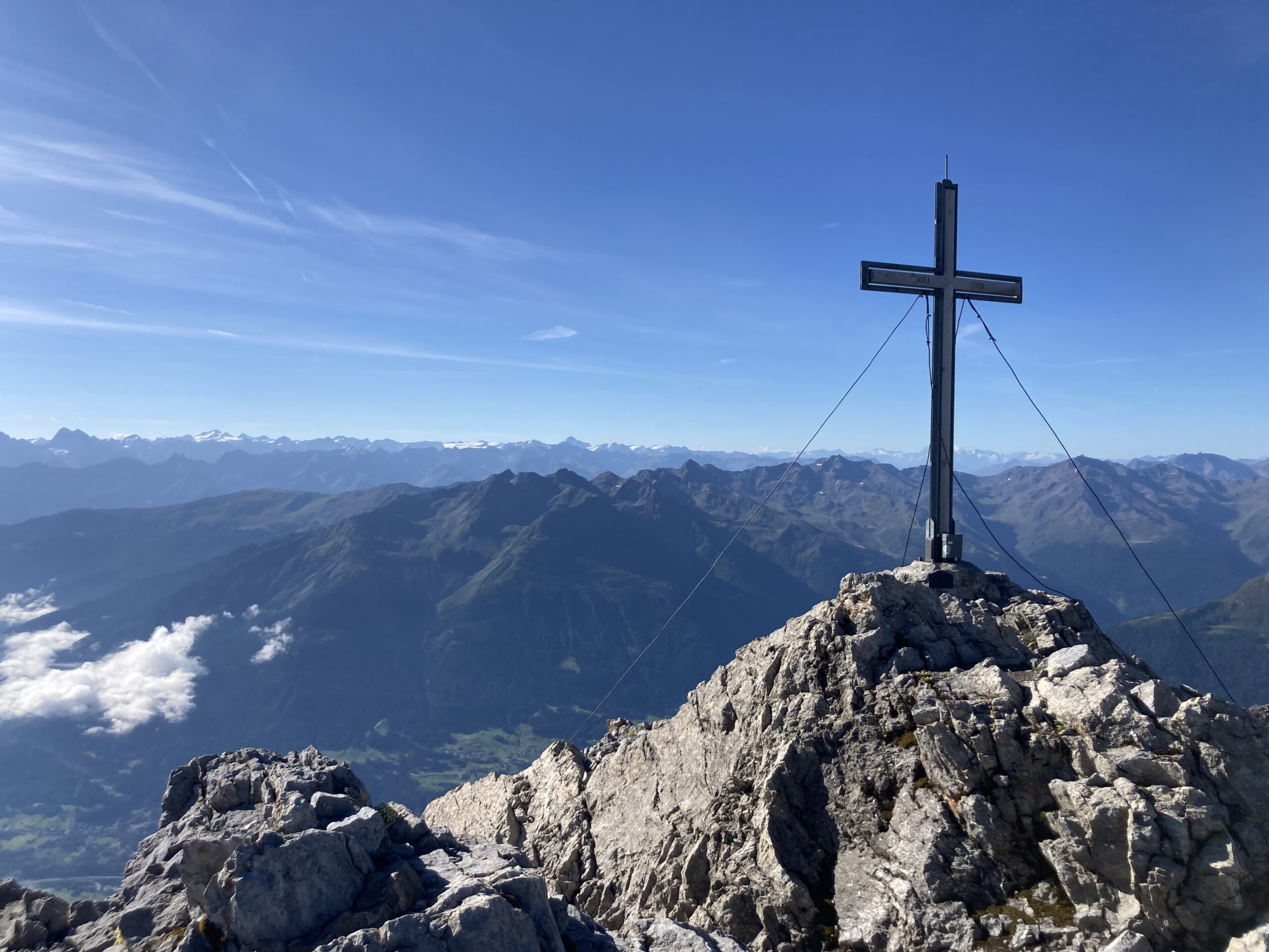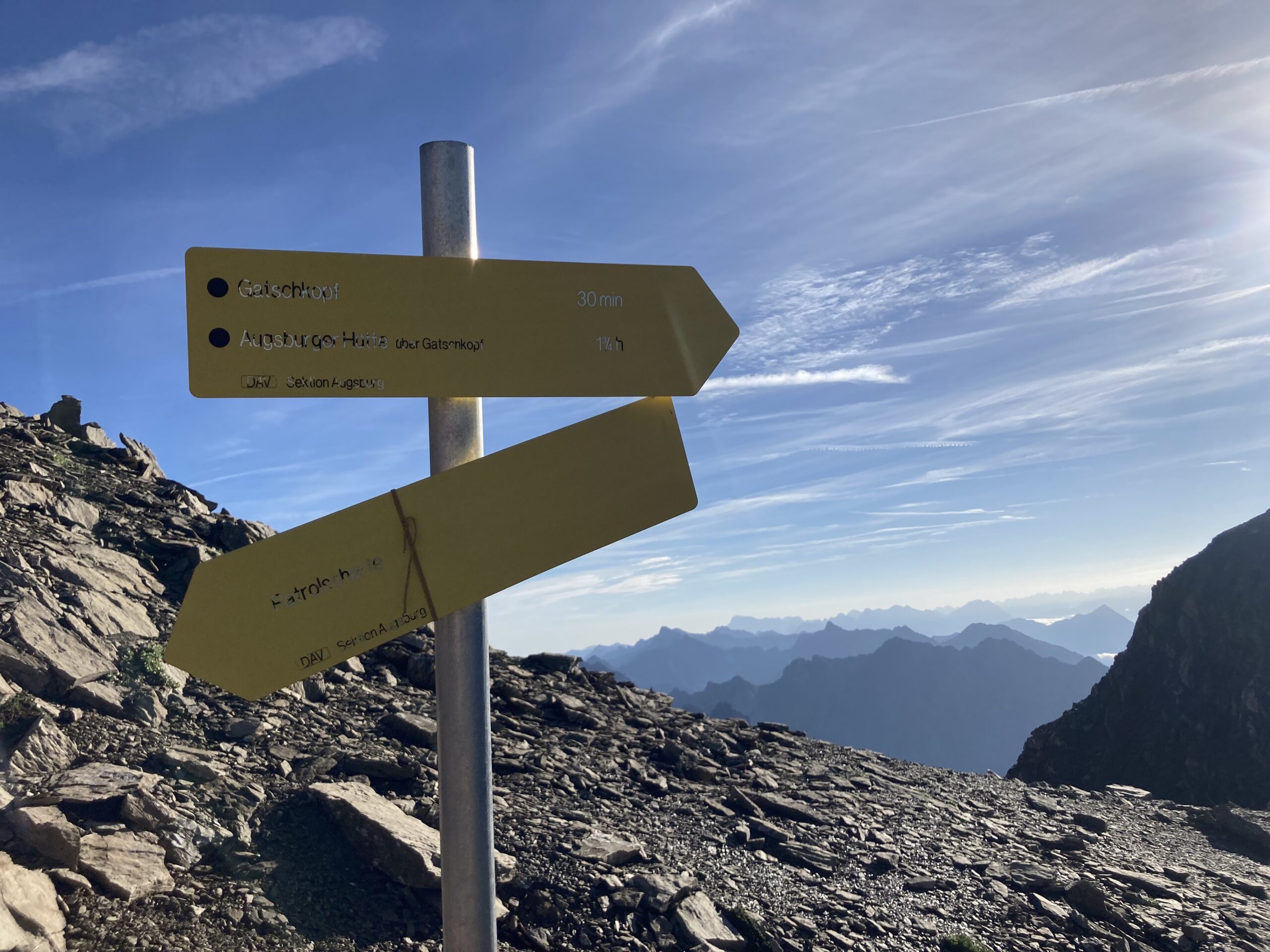 Wecker 5:30 Uhr Thermofrühstück, die Hüttenwirtin hat uns alles schön vorbereiten, Super! kurz nach 6 Uhr Aufbruch, steiler Weg hoch zum Gatschkopf aber einfach, am Gipfel tolle Aussicht mit der bereits aufgegangenen Sonne / beinahe Sonnenaufgang, kalter Wind, kurz Pause gemacht, Abstieg in die Scharte Richtung Parseierspitze Ostgrat, Helm aufgesetzt, dann los zum Ostgrat, anfangs einfache Kletterei, dann ansteigend mal recht, mal links vom Grat, Schlüsselstelle 3+/4-, ich voraus, hat sich eigentlich gut angefühlt, Raphael und Roland sind die dann unten umgangen, weiterhin schöne Kletterei ich 2. Schwierigkeitsgrat, fester Fels, leider zu kurz, schnell am Gipfel, Pause am Gipfel, tolle Aussicht, kaum Wolken, Abstieg über Normalweg, unschön, schwierig, unten mit Stahlseil auf den Schnee und gequert zur Schlucht, durch die Schlucht/Geröllfeld heute viel schneller wie gestern zurück zur Augsburger Hütte, an der Hütte erst mal Kommentar von der Hüttenwirtin „da hätte es kein Thermofrühstück gebraucht“ und Enzian-Schnaps bekommen, cool, alkoholfreies Weizen und Kuchen auf der Terrasse genossen, dann Abstieg nach Grins und weiter nach Pians zur Bushaltestelle, Raphael verabschiedet, Bus nach Pettneu zum Auto und mit dem Auto nach Boden über das Hahntennjoch, welches zu diesem Zeitpunkt noch offen war, am Wanderparkplatz Rucksack umgepackt und dann Aufstieg zur Hanauer Hütte, sehr schnell, Winterweg, Training, TOP, längere Pause auf der Terrasse, alkoholfreies Weizen, Skiwasser, keine Übernachtung reserviert, Abend gegessen, Käsespätzle, dann nach Lager gefragt, Rucksack für nächsten Tag gepackt und dann ins Bett, sehr gut geschlafen, nichts vom schweren Gewitter in der Nacht mitbekommen