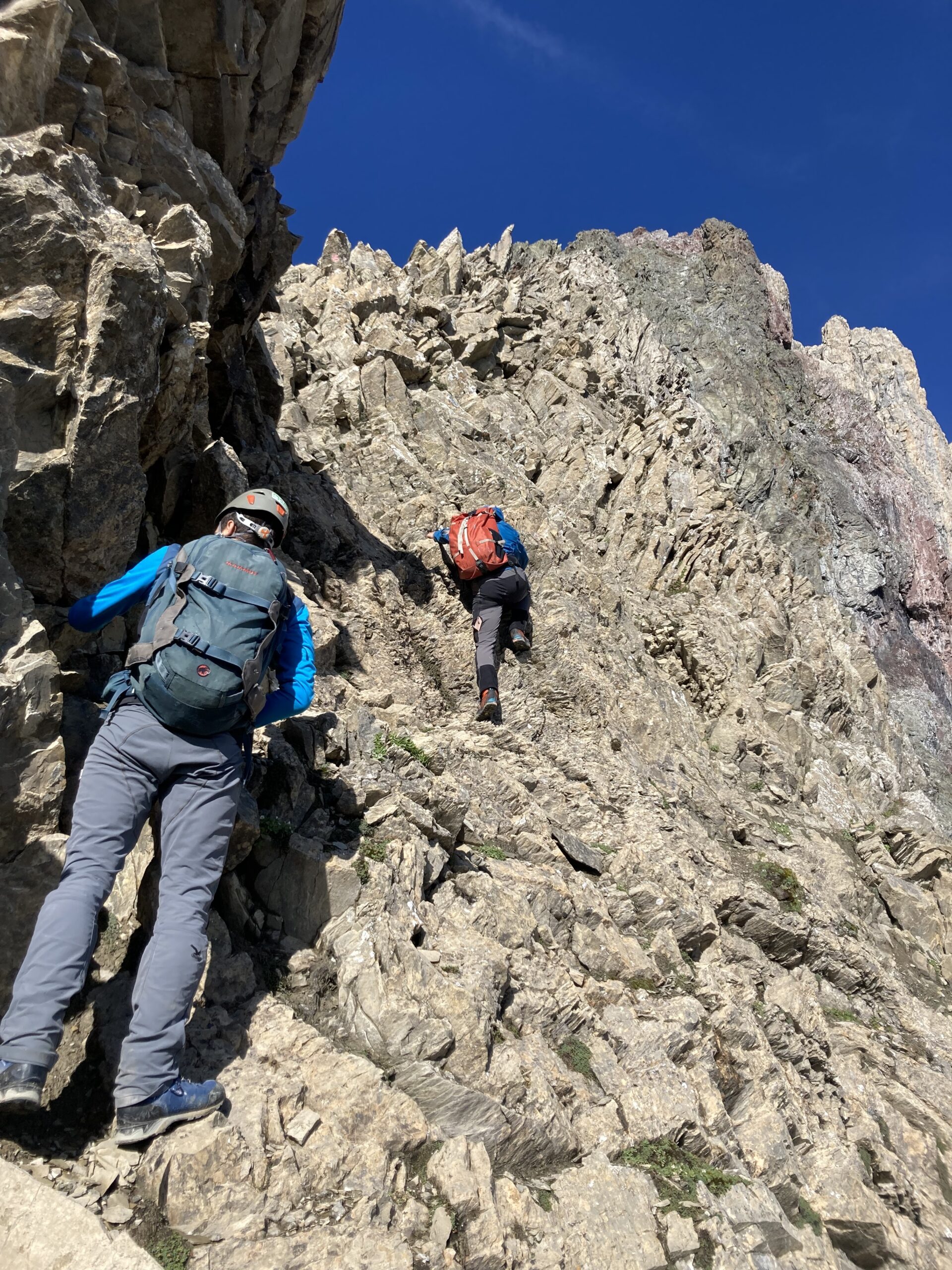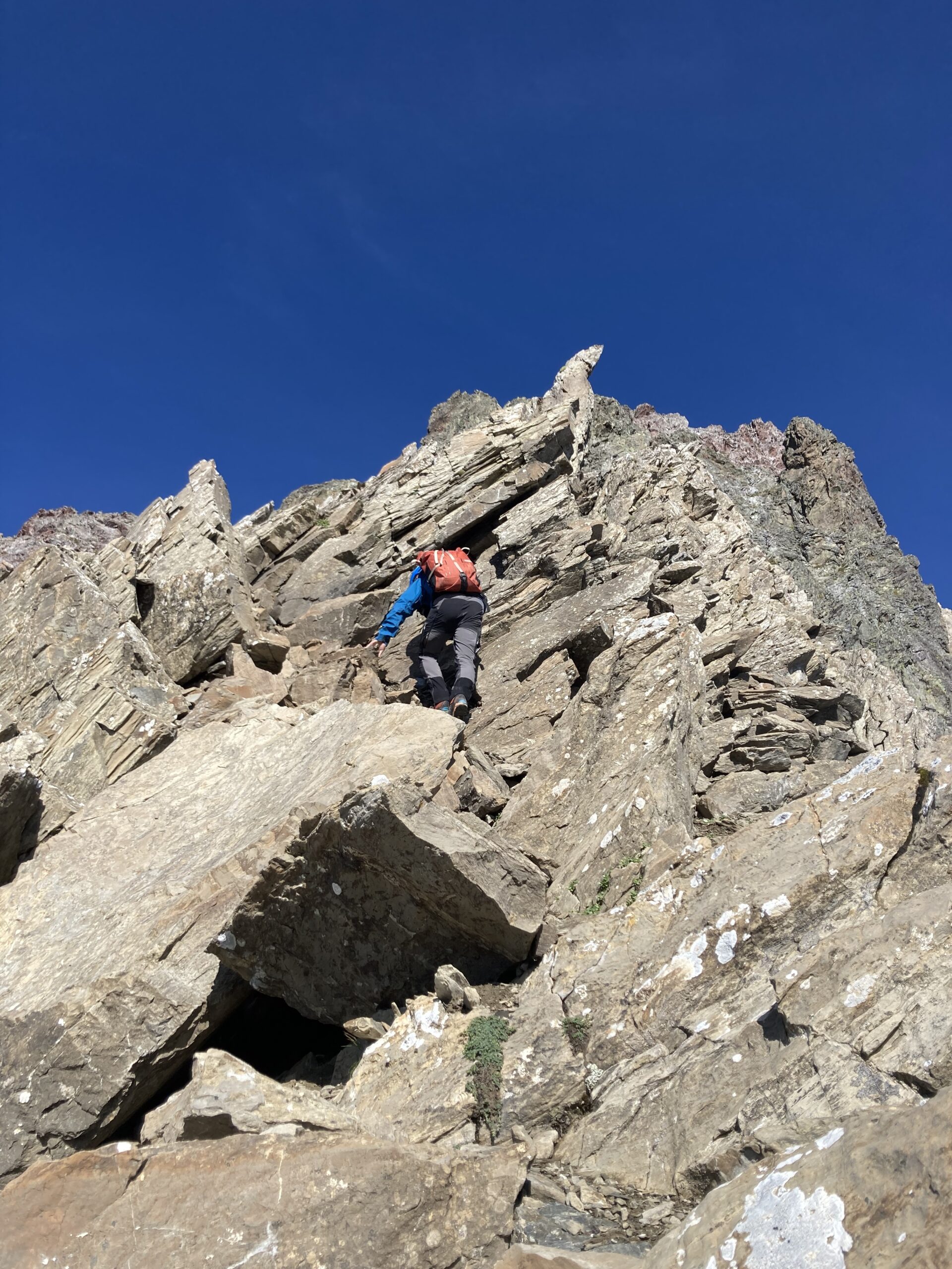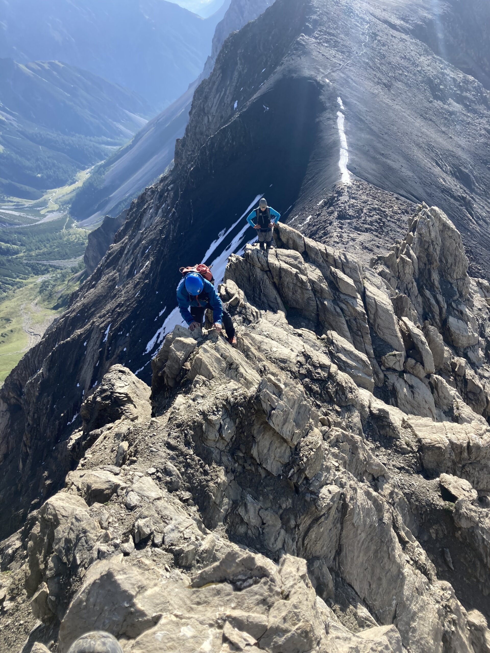 Wecker 5:30 Uhr Thermofrühstück, die Hüttenwirtin hat uns alles schön vorbereiten, Super! kurz nach 6 Uhr Aufbruch, steiler Weg hoch zum Gatschkopf aber einfach, am Gipfel tolle Aussicht mit der bereits aufgegangenen Sonne / beinahe Sonnenaufgang, kalter Wind, kurz Pause gemacht, Abstieg in die Scharte Richtung Parseierspitze Ostgrat, Helm aufgesetzt, dann los zum Ostgrat, anfangs einfache Kletterei, dann ansteigend mal recht, mal links vom Grat, Schlüsselstelle 3+/4-, ich voraus, hat sich eigentlich gut angefühlt, Raphael und Roland sind die dann unten umgangen, weiterhin schöne Kletterei ich 2. Schwierigkeitsgrat, fester Fels, leider zu kurz, schnell am Gipfel, Pause am Gipfel, tolle Aussicht, kaum Wolken, Abstieg über Normalweg, unschön, schwierig, unten mit Stahlseil auf den Schnee und gequert zur Schlucht, durch die Schlucht/Geröllfeld heute viel schneller wie gestern zurück zur Augsburger Hütte, an der Hütte erst mal Kommentar von der Hüttenwirtin „da hätte es kein Thermofrühstück gebraucht“ und Enzian-Schnaps bekommen, cool, alkoholfreies Weizen und Kuchen auf der Terrasse genossen, dann Abstieg nach Grins und weiter nach Pians zur Bushaltestelle, Raphael verabschiedet, Bus nach Pettneu zum Auto und mit dem Auto nach Boden über das Hahntennjoch, welches zu diesem Zeitpunkt noch offen war, am Wanderparkplatz Rucksack umgepackt und dann Aufstieg zur Hanauer Hütte, sehr schnell, Winterweg, Training, TOP, längere Pause auf der Terrasse, alkoholfreies Weizen, Skiwasser, keine Übernachtung reserviert, Abend gegessen, Käsespätzle, dann nach Lager gefragt, Rucksack für nächsten Tag gepackt und dann ins Bett, sehr gut geschlafen, nichts vom schweren Gewitter in der Nacht mitbekommen